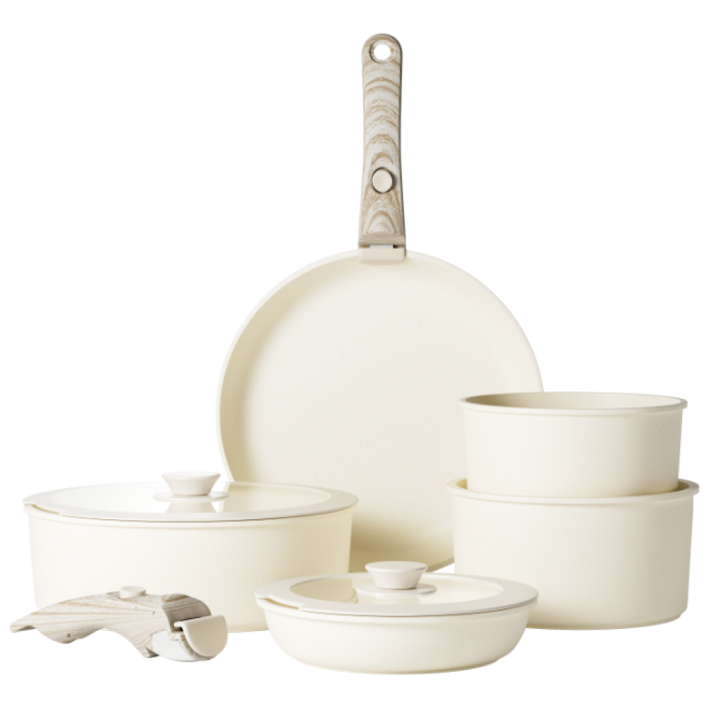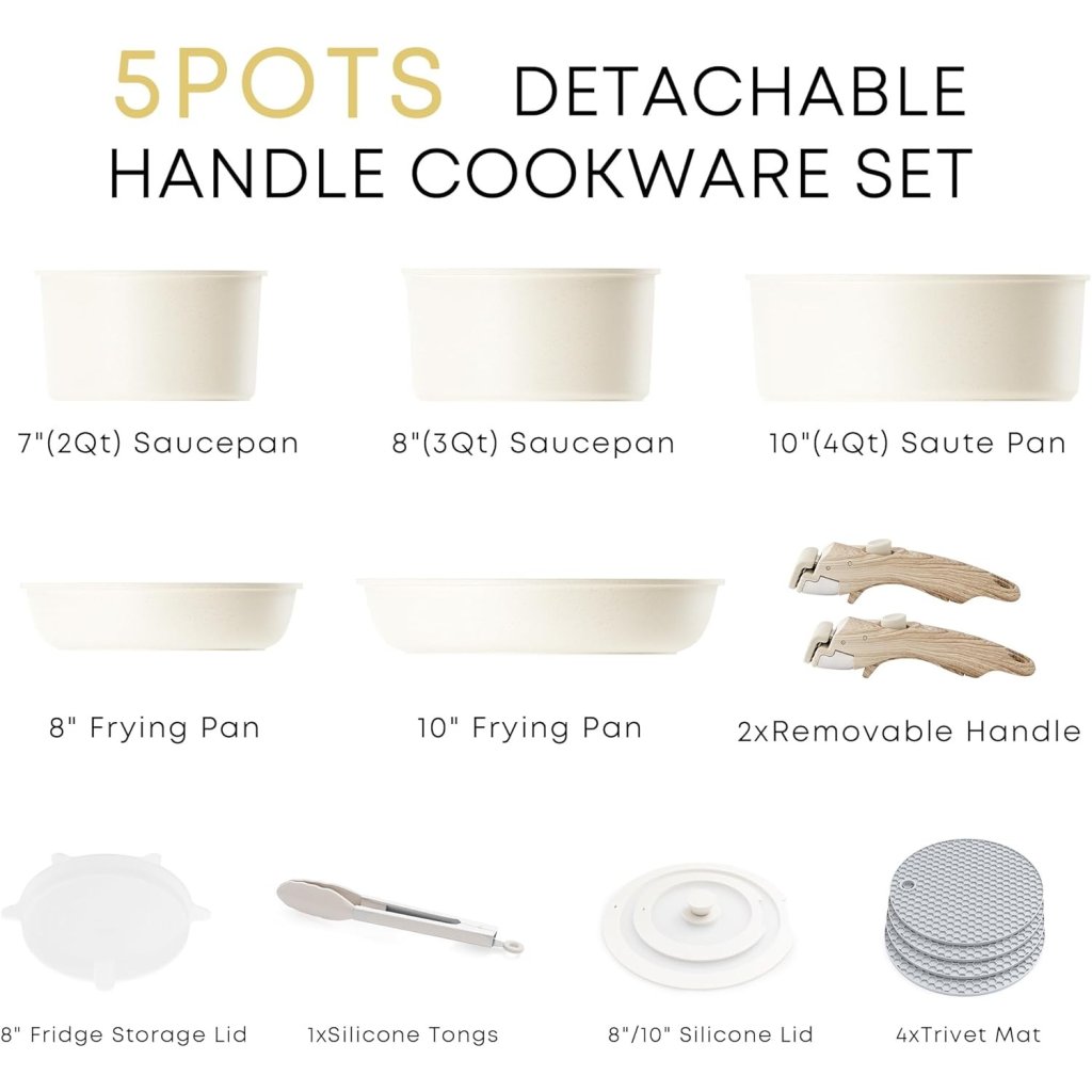 鍋具包含 | 7" (2Qt) 醬汁鍋、8" (3Qt) 醬汁鍋、8"煎鍋、10"煎鍋、10" (4Qt)炒鍋、可拆式手柄 2 支,矽膠蓋2個 |