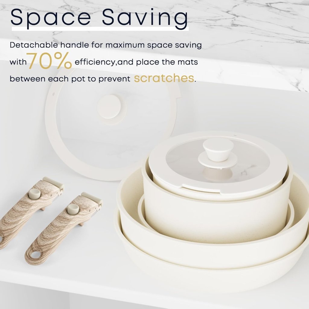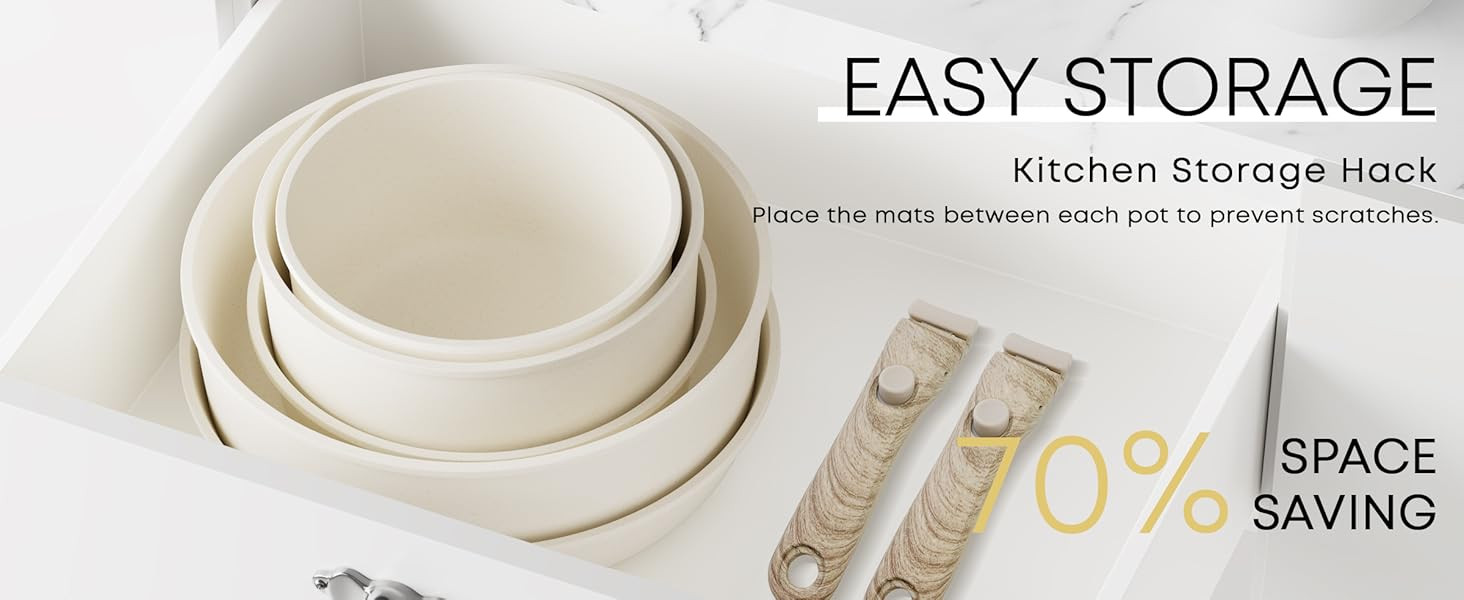 - 節省更多空間 - 將手柄拆下並將每件物品嵌入另一個。 將墊子放在每個鍋之間以防止刮傷,其他品牌不可用。