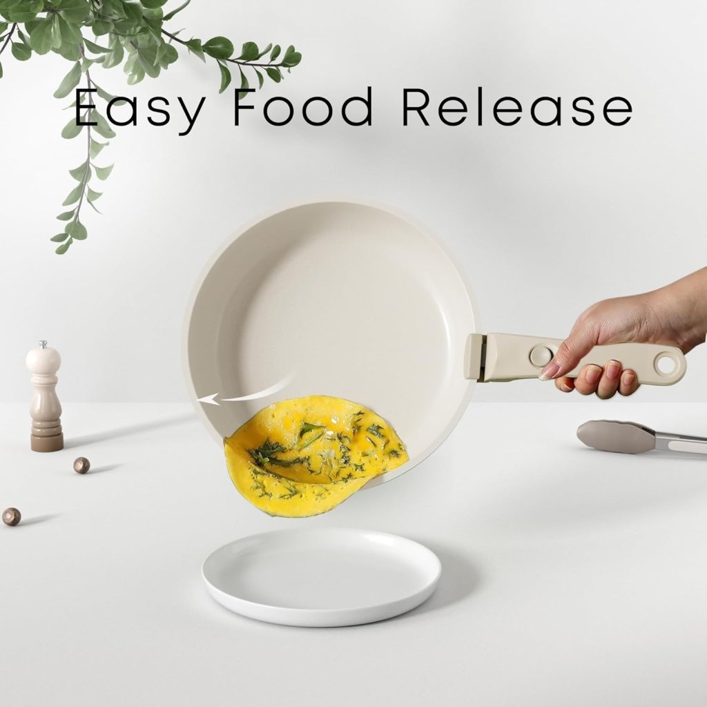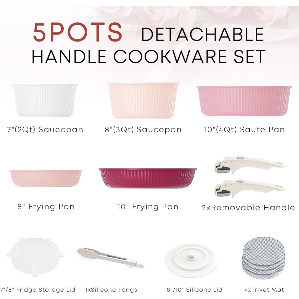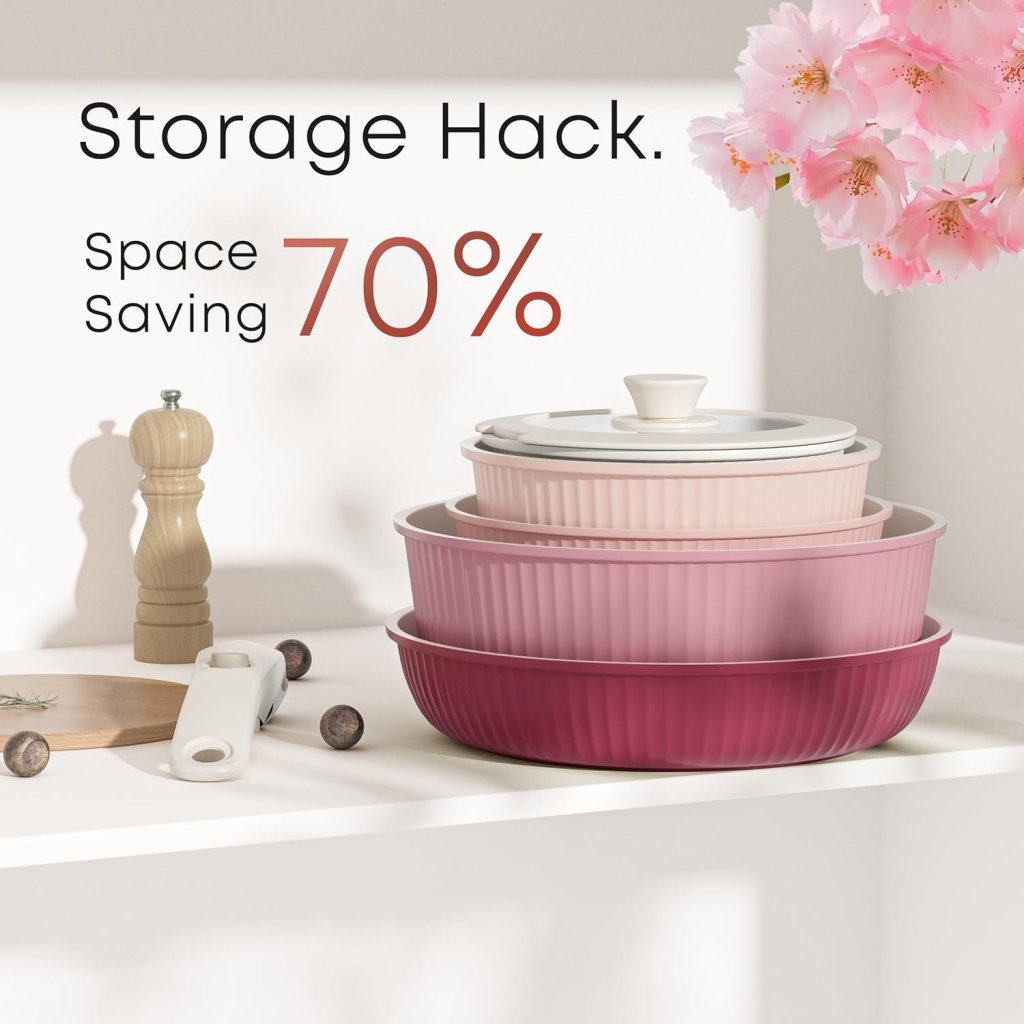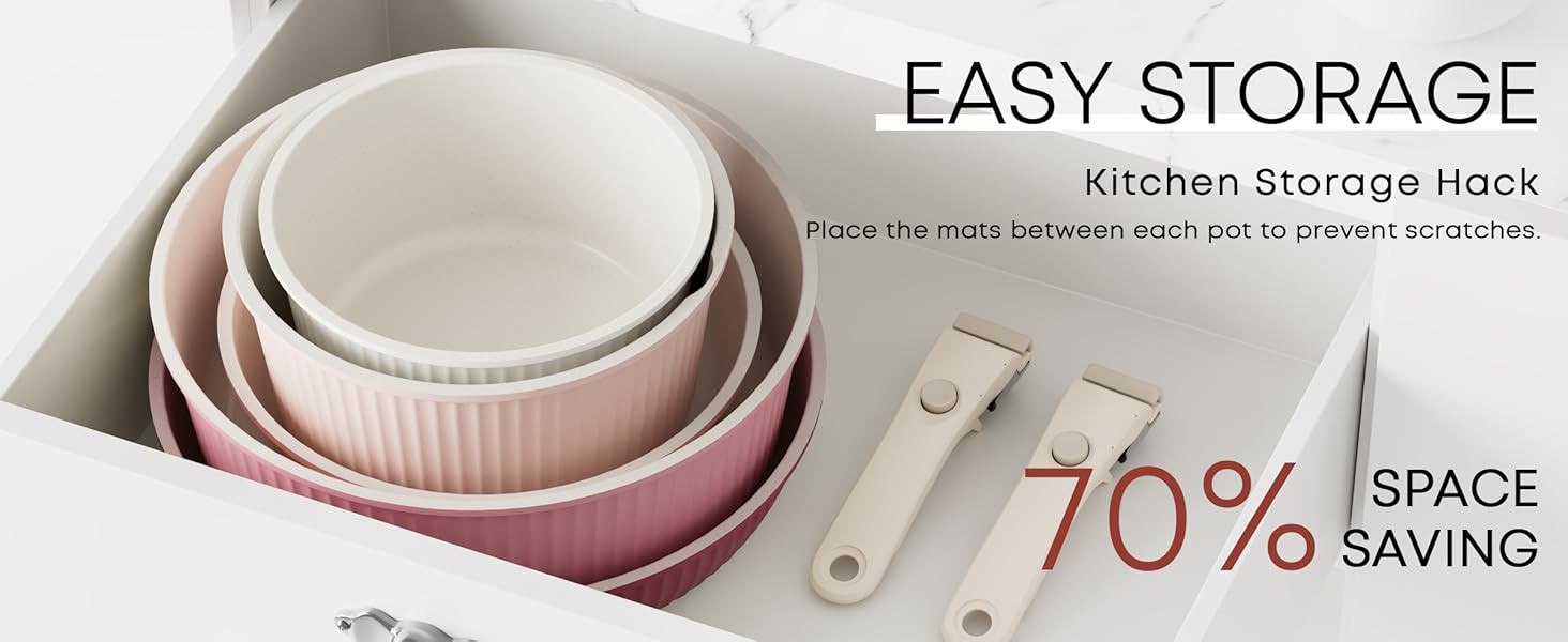 • 節省更多空間 - 將手柄拆下並將每件物品嵌入另一個。 將墊子放在每個鍋之間以防止刮傷,其他品牌不可用。