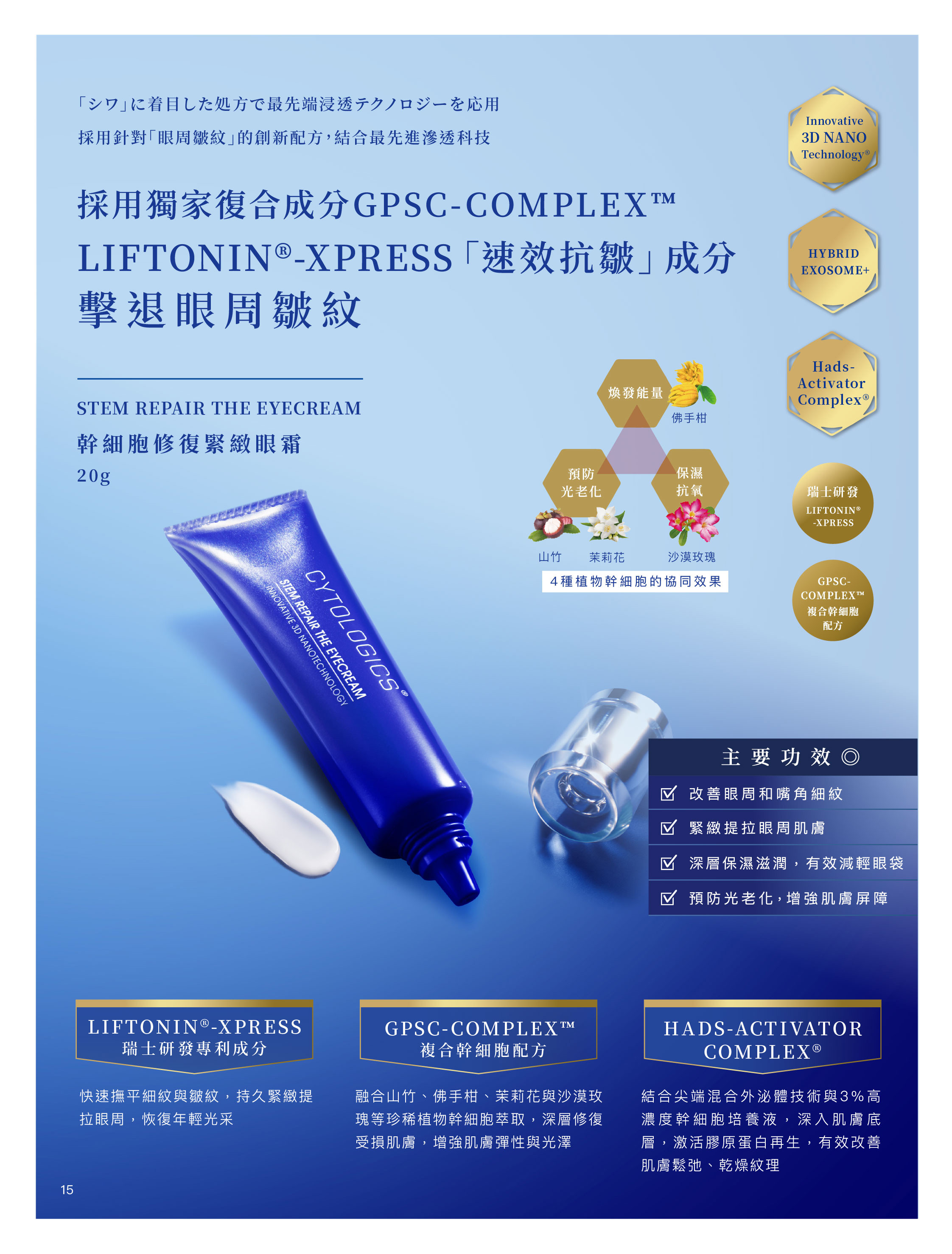 • GPSC-COMPLEX™ + 幹細胞複合成分:修復眼周肌膚,對抗藍光與環境損傷。