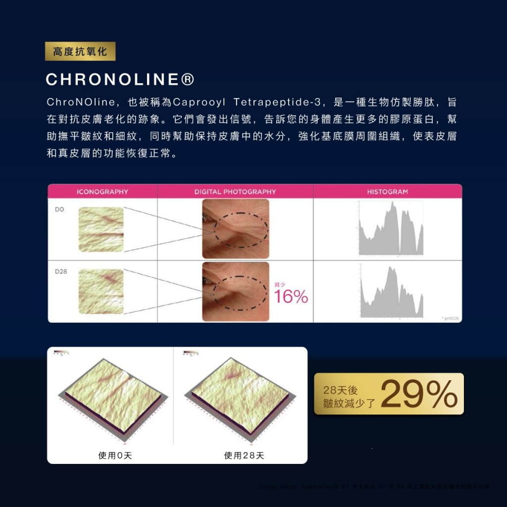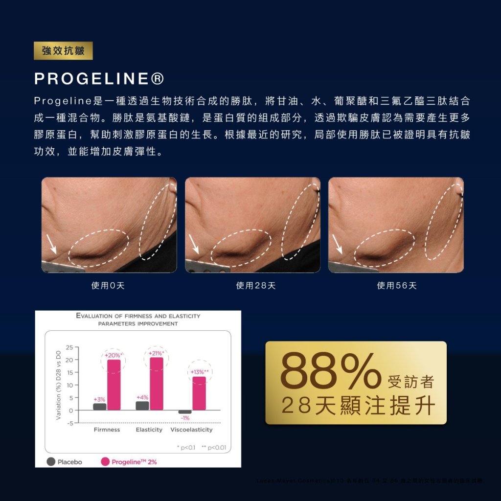 - 金獎成分 Progeline™ 和 Chronoline™,針對鬆弛與皺紋,從肌底強化結構,實現緊緻提拉效果。