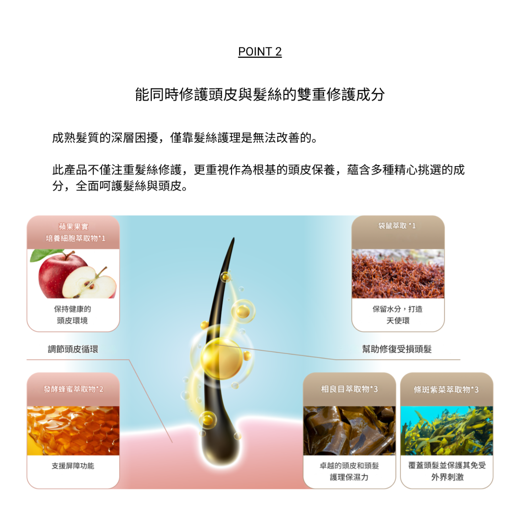 專為熟齡及受損髮質設計,深層修復髮芯空洞,重拾健康光澤髮感