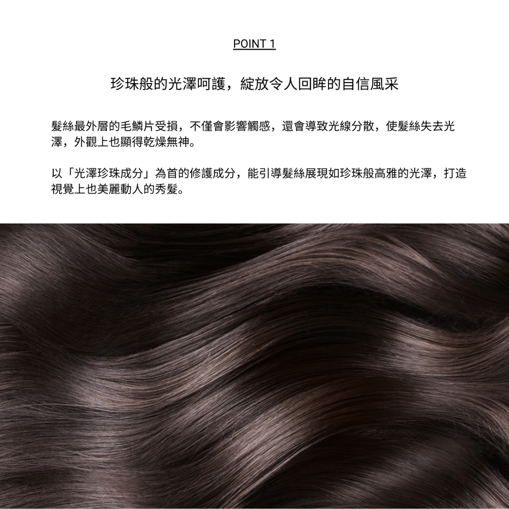 雙重珍珠光豔配方,令髮絲有驚豔的光澤感