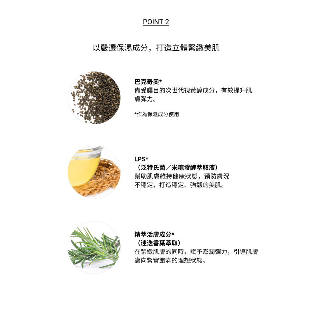 • Rosemary精華:緊緻毛孔,改善鬆弛與暗沉