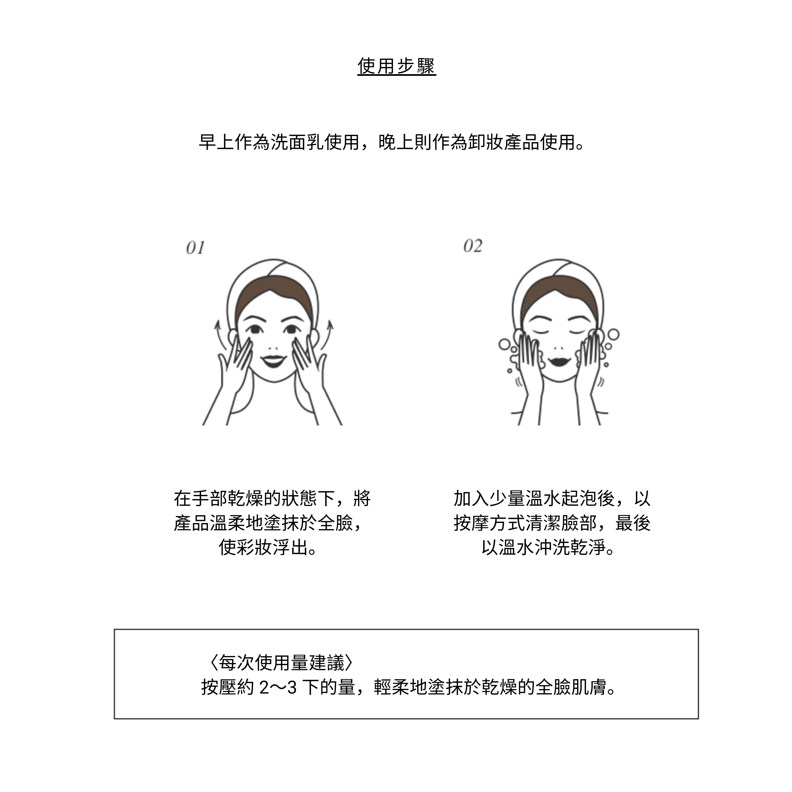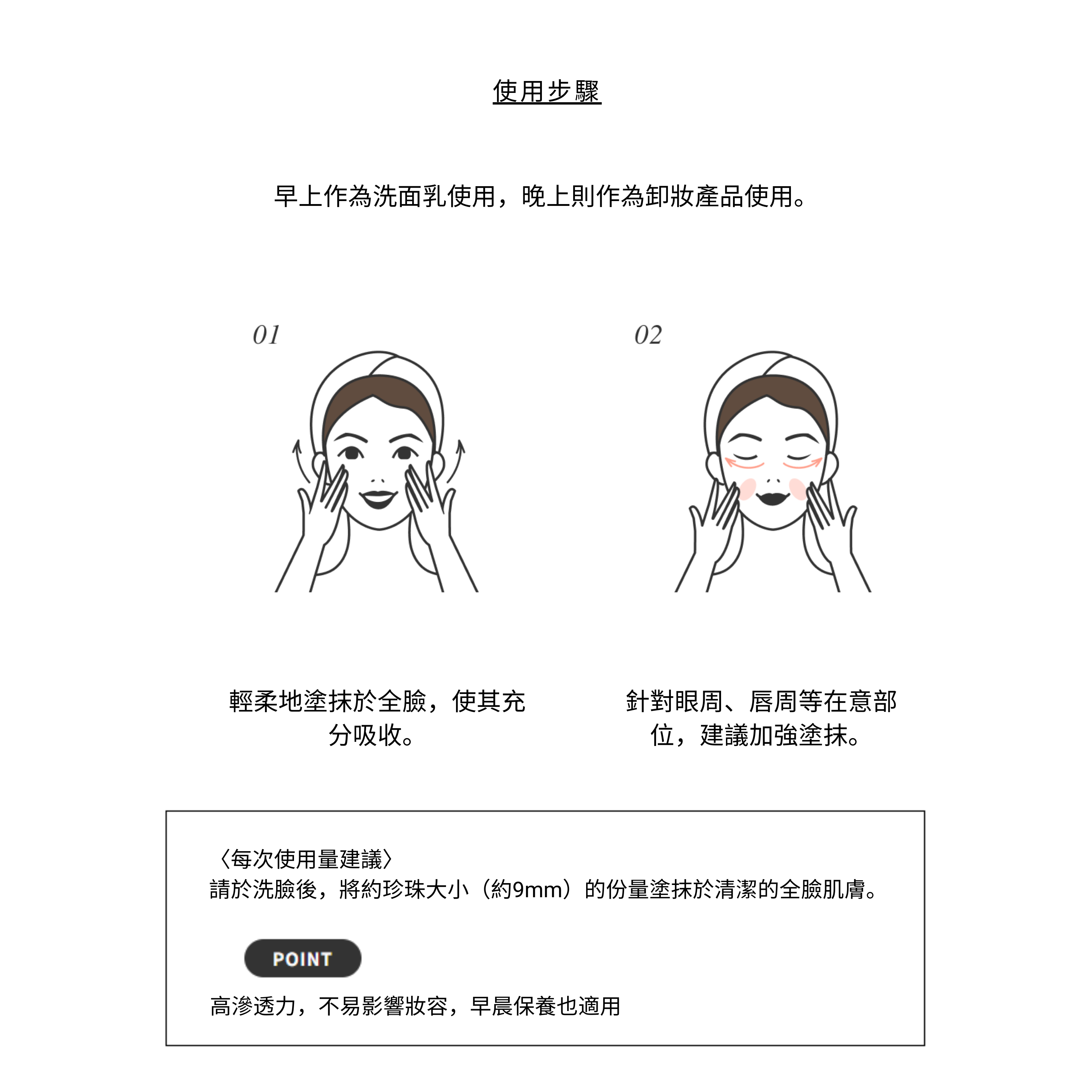 • 使用時由凝膠轉化為綿密泡沫,潔淨同時具備按摩效果,可用於臉部與頸部,甚至適用於睫毛嫁接後的清潔。