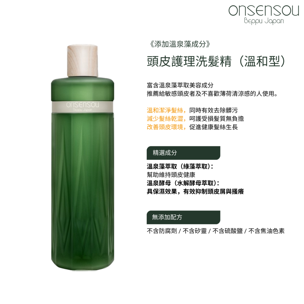 1) onsensou 頭皮控油溫和型洗髮水是溫和版本,富含從溫泉藻類中萃取的美容成分,特別適合不喜歡清涼感或頭皮較敏感的人使用。