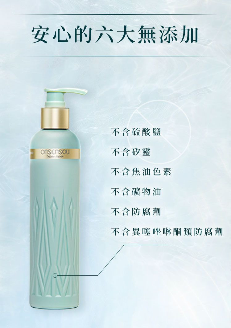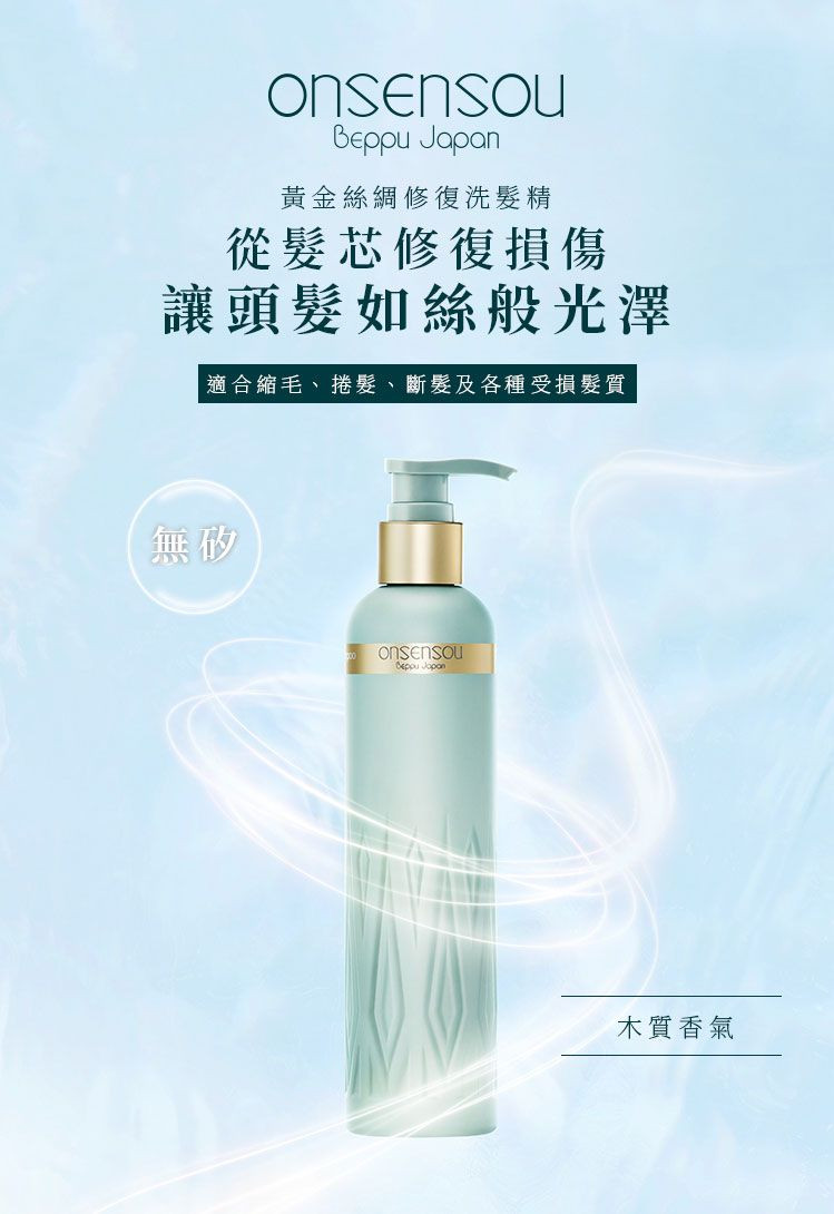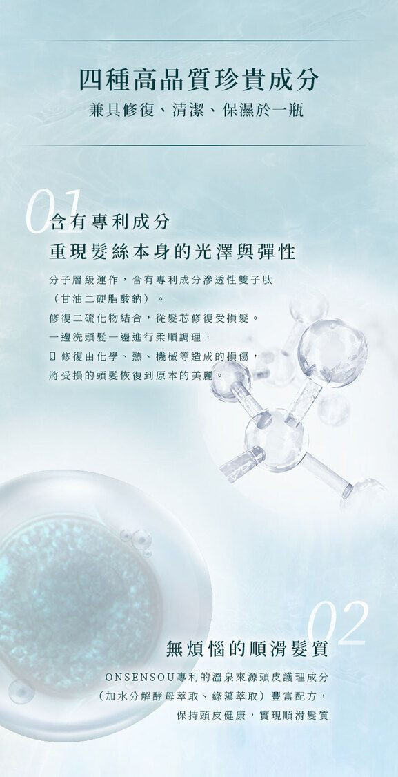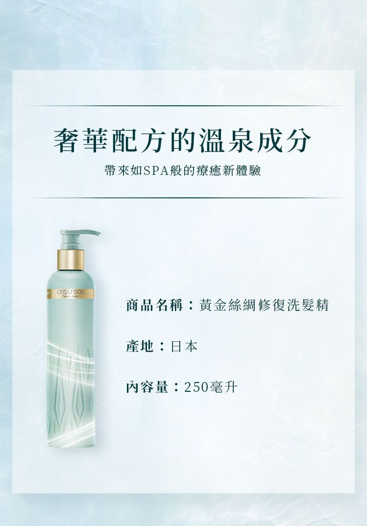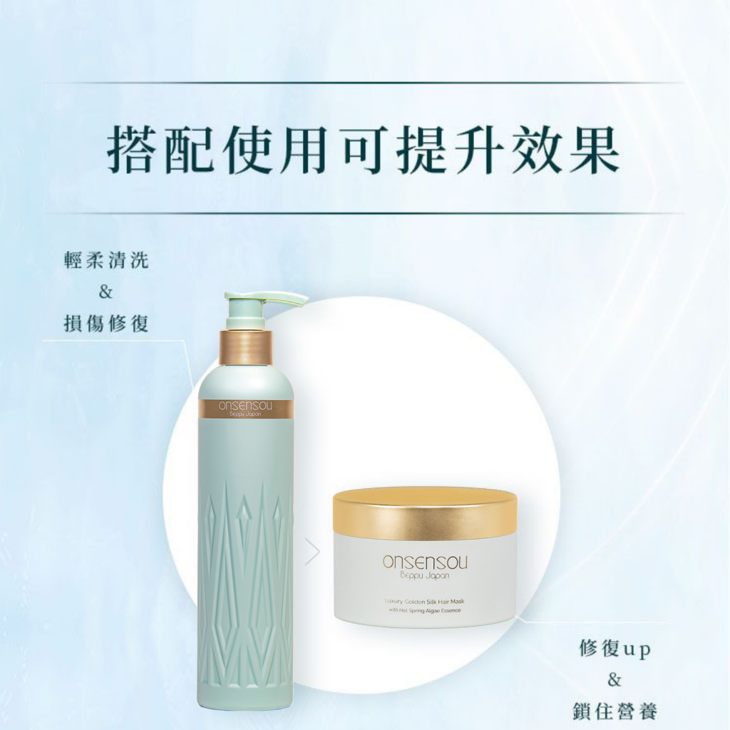 • 溫泉來源成分調理頭皮,並修護髮尾