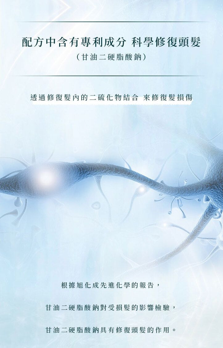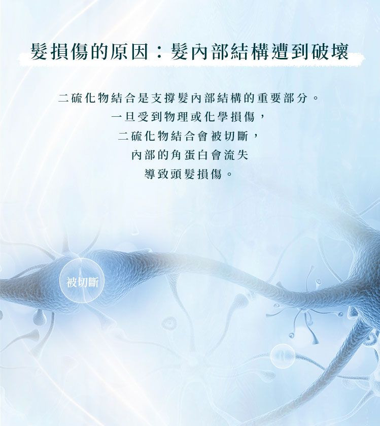 • 修復髮絲內部的二硫鍵結構,深層修護受損髮質