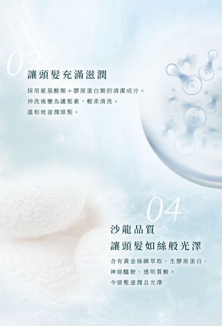 • 深層修護受損髮質,重現蠶絲般的光澤與柔順