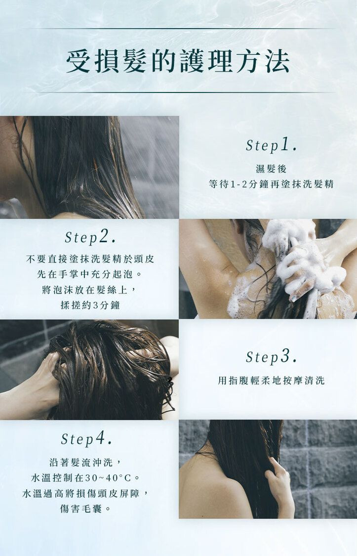 • 洗髮同時進行柔順調理,改善因化學處理、熱傷害、機械拉扯造成的損傷