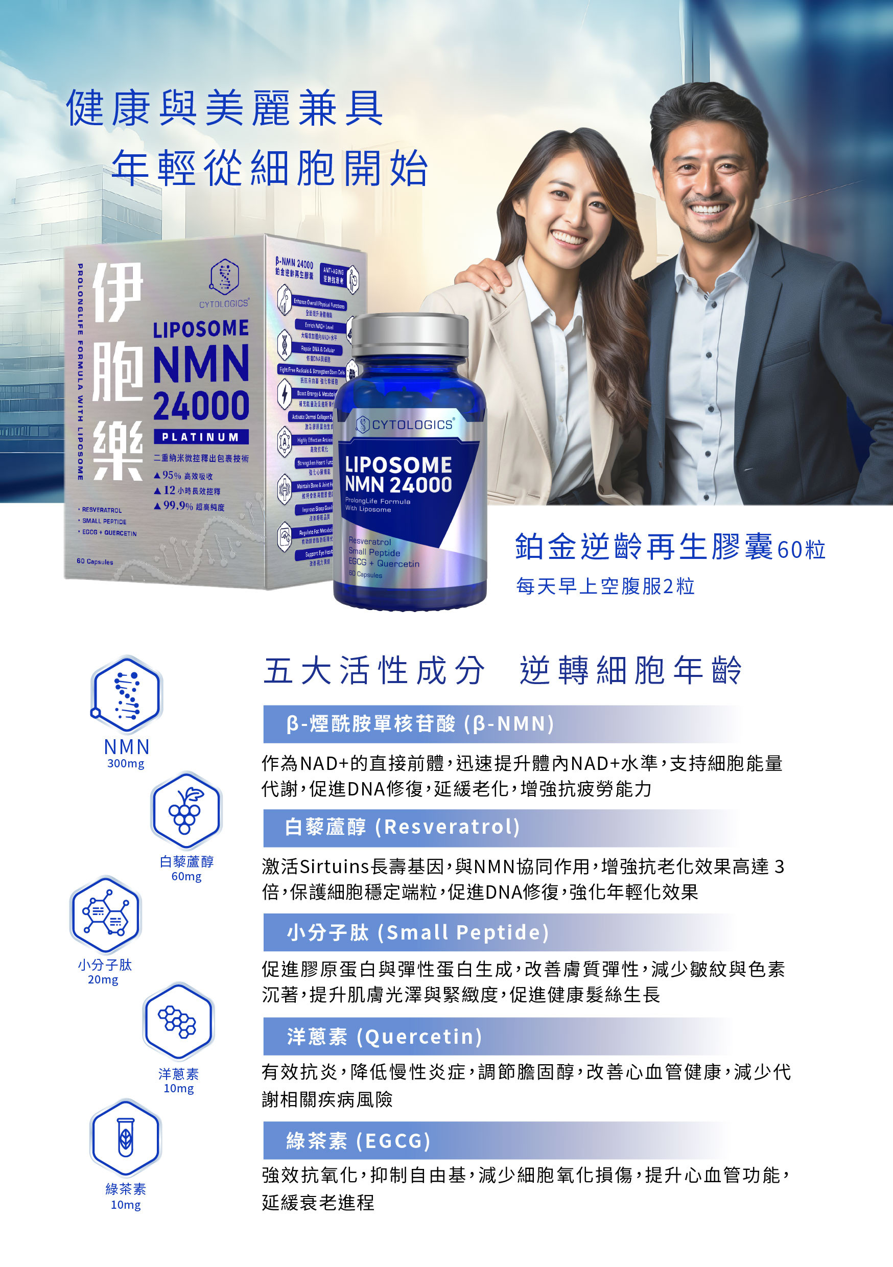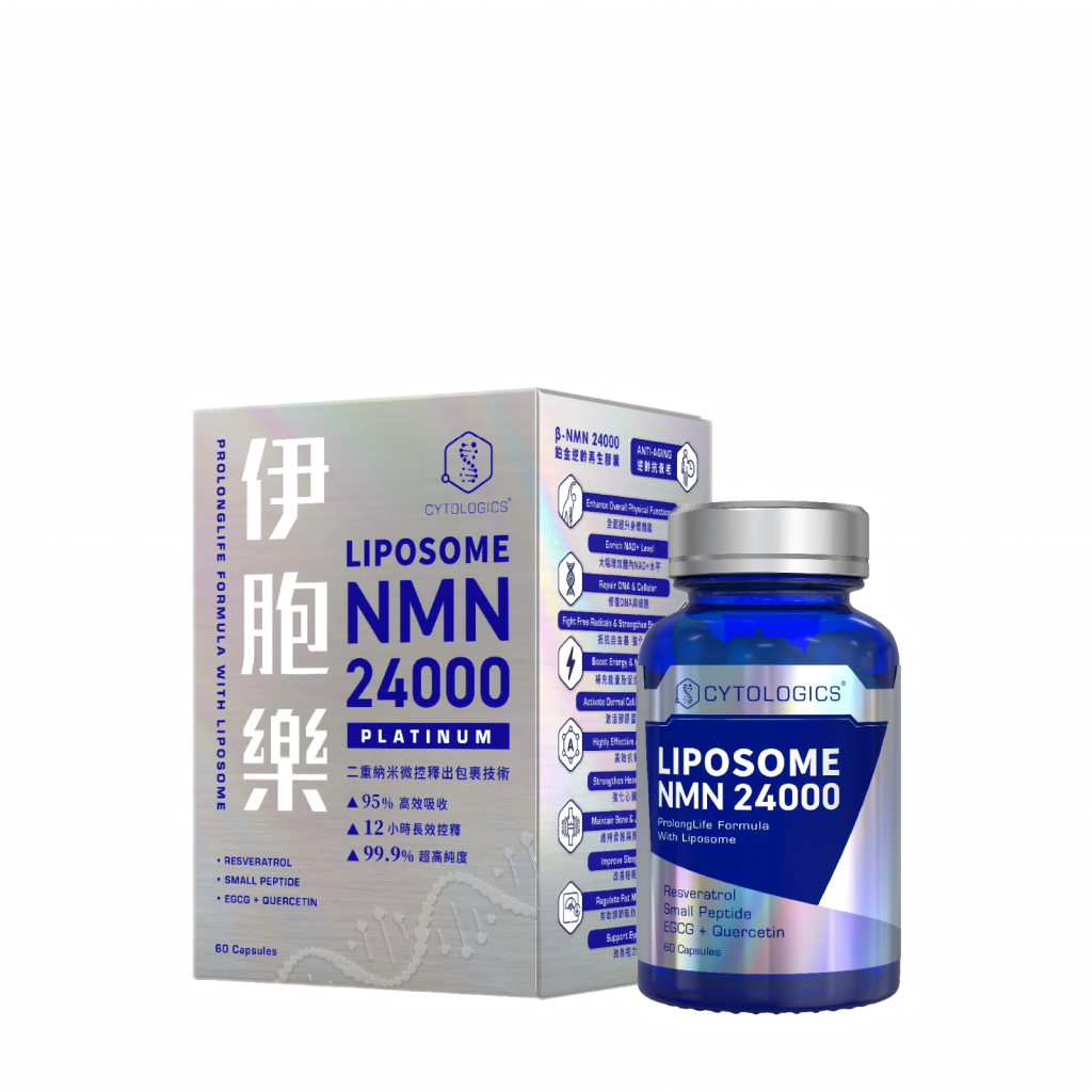 CYTOLOGICS伊胞樂 β-NMN 24000 鉑金逆齡再生膠囊 是在「加強版」的基礎上進一步升級,專為追求健康與美麗兼得的消費者量身打造。添加 小分子肽、洋蔥素與綠茶素,全面提升抗衰老、美容修復及膚質改善功效。產品採用 LIPOSOME脂質體「二重納米微控釋出包裹技術」,吸收效率提升 5倍,核心成分直達細胞層面,不僅有效延緩衰老,還能顯著提升能量、增強免疫力,改善肌膚彈性與光澤,實現真正的逆齡效果!