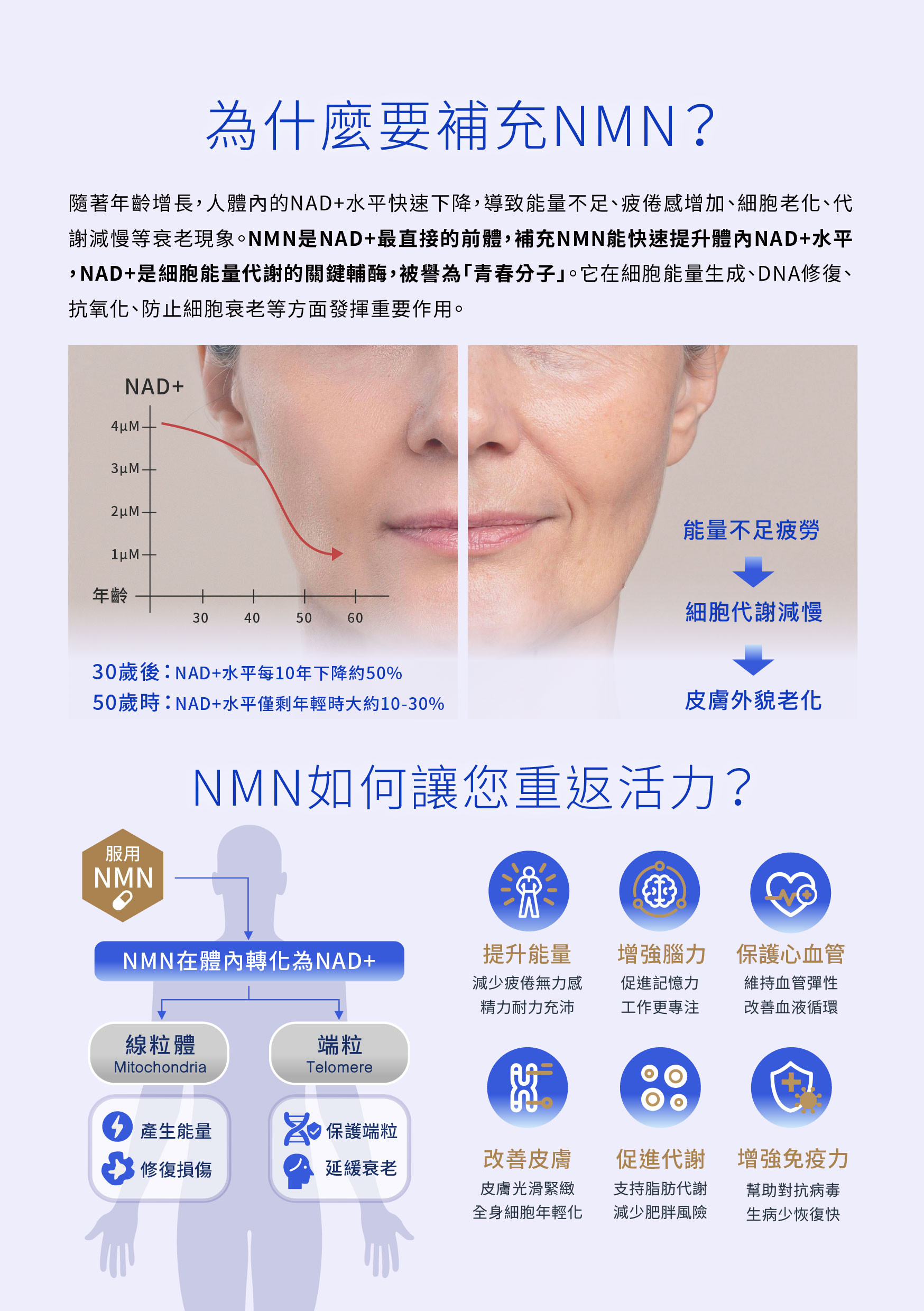 • 功效:顯著提升 NAD+ 水平,支持細胞修復與代謝,有效延緩衰老進程。