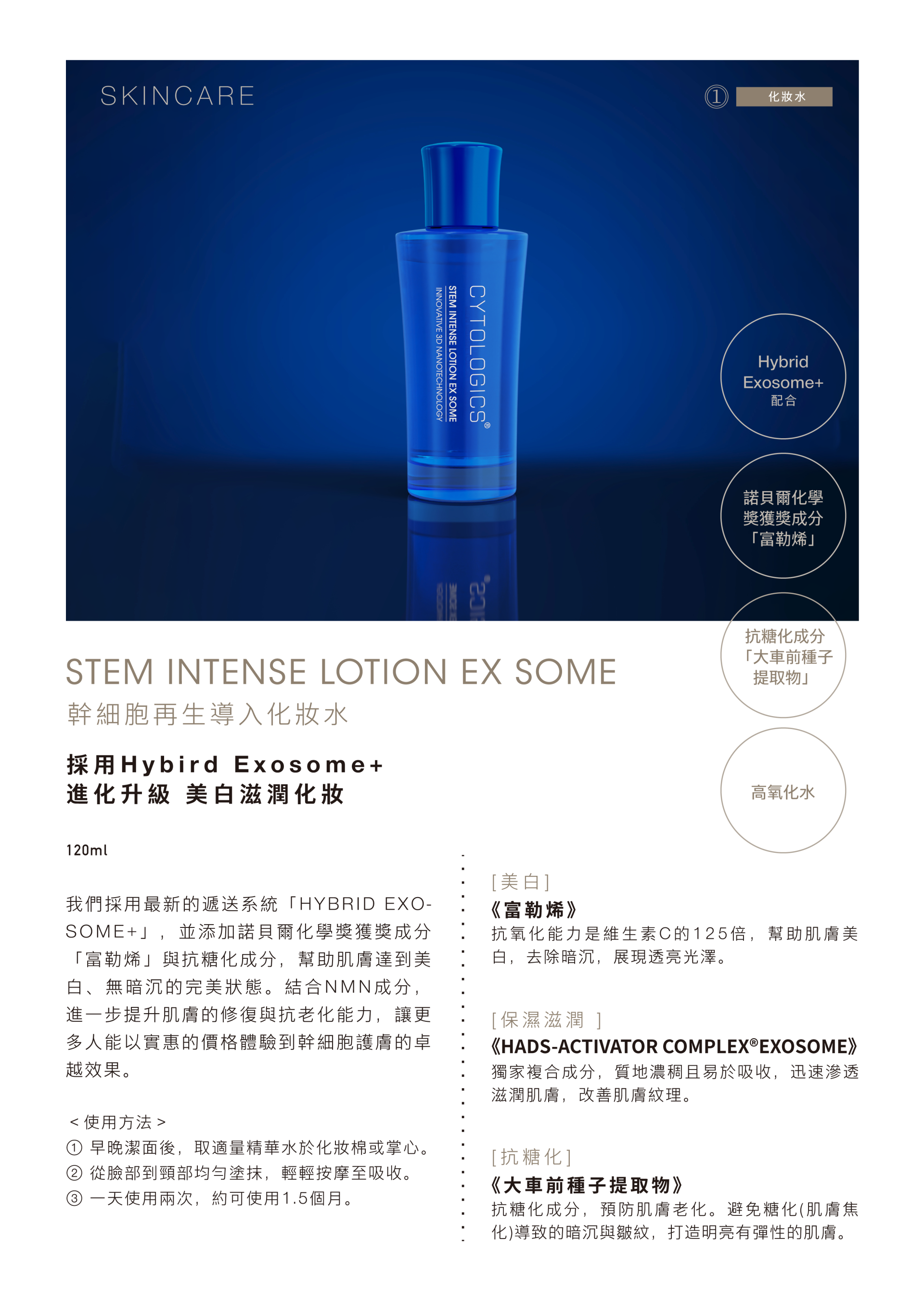 以尖端科技「HYBRID EXOSOME+ 混合型外泌體」、幹細胞培養液及諾貝爾獎成分「富勒烯」為核心,融合抗糖化成分,全面提升肌膚自我修復能力。