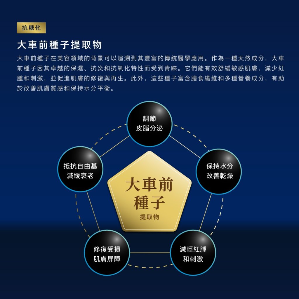 1. 抗糖化:富含車前子萃取物,減少因糖化引起的暗沉與皺紋,保持肌膚光澤與彈性。