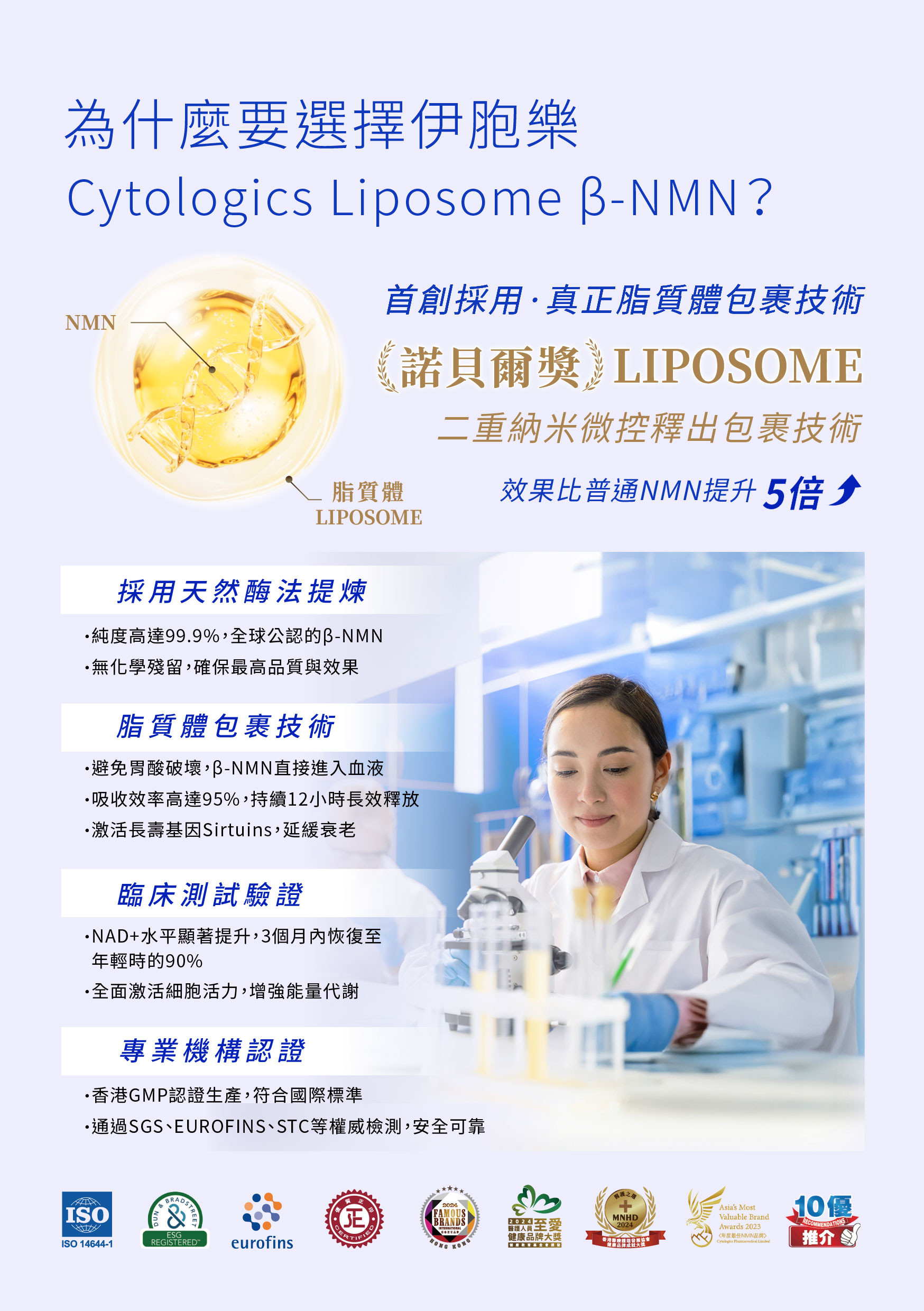 CYTOLOGICS 伊胞樂 β-NMN 24000 黄金逆齡再生膠囊 是一款頂級逆齡營養補充品,專注於細胞抗衰老、能量提升、