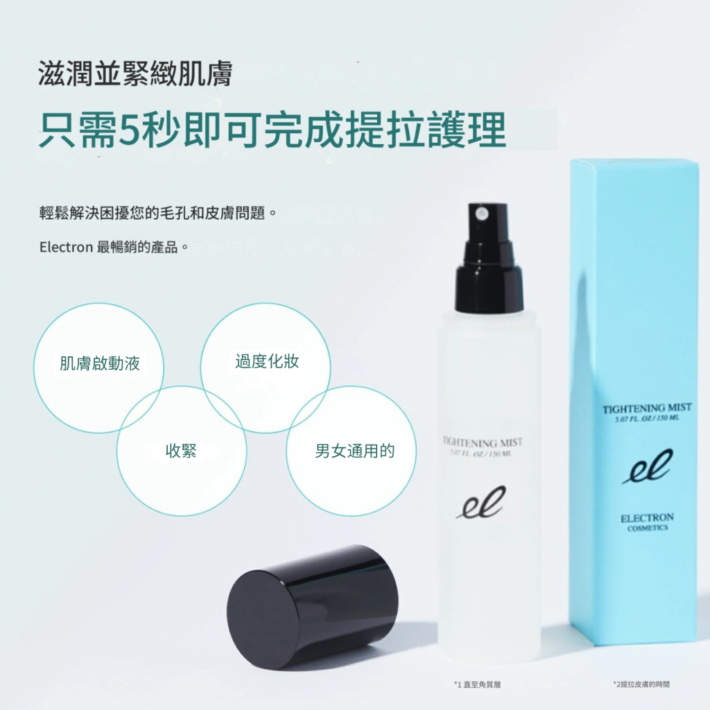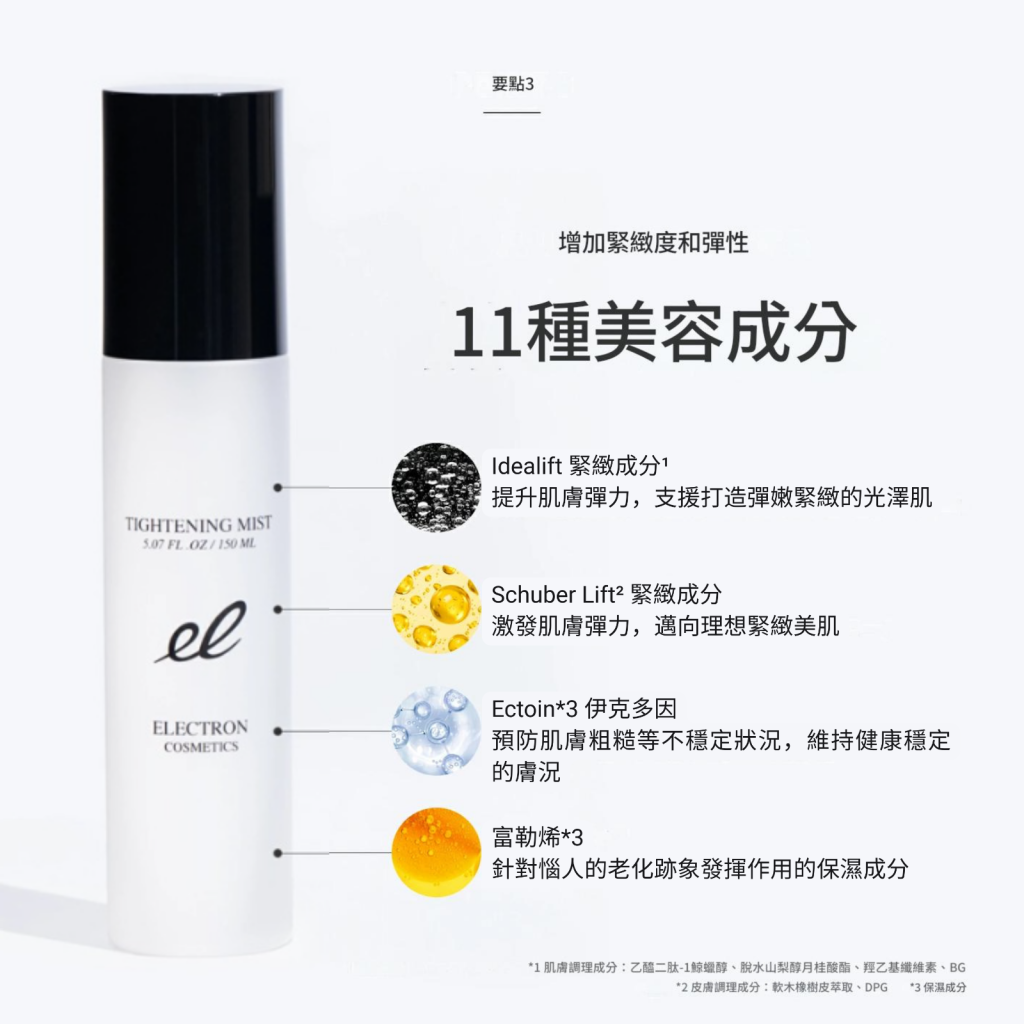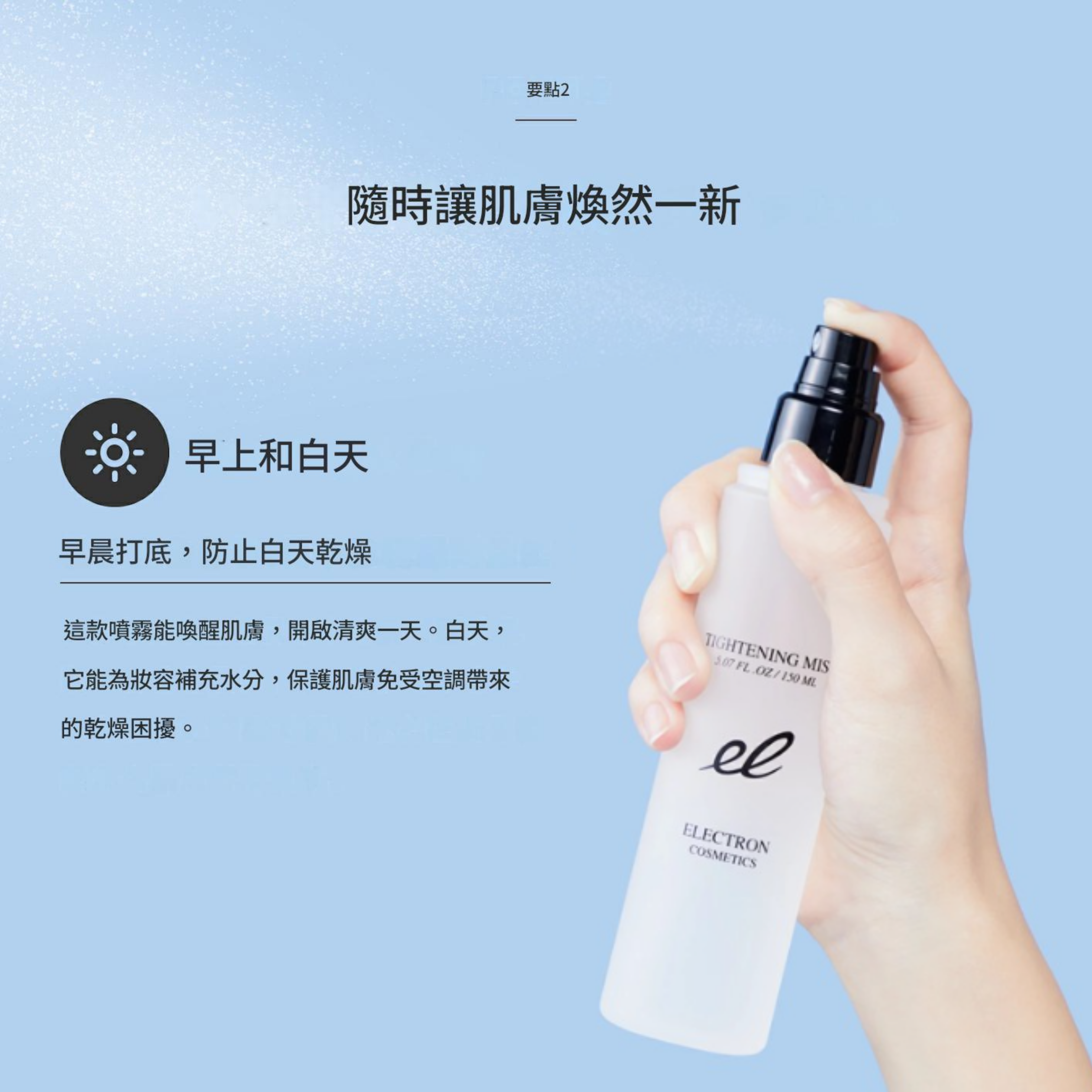 TIGHTENING MIST 提拉緊緻噴霧結合活性電子水™科技與臨床級緊緻成分,不僅是爽膚水,更是肌膚吸收力的啟動器。
