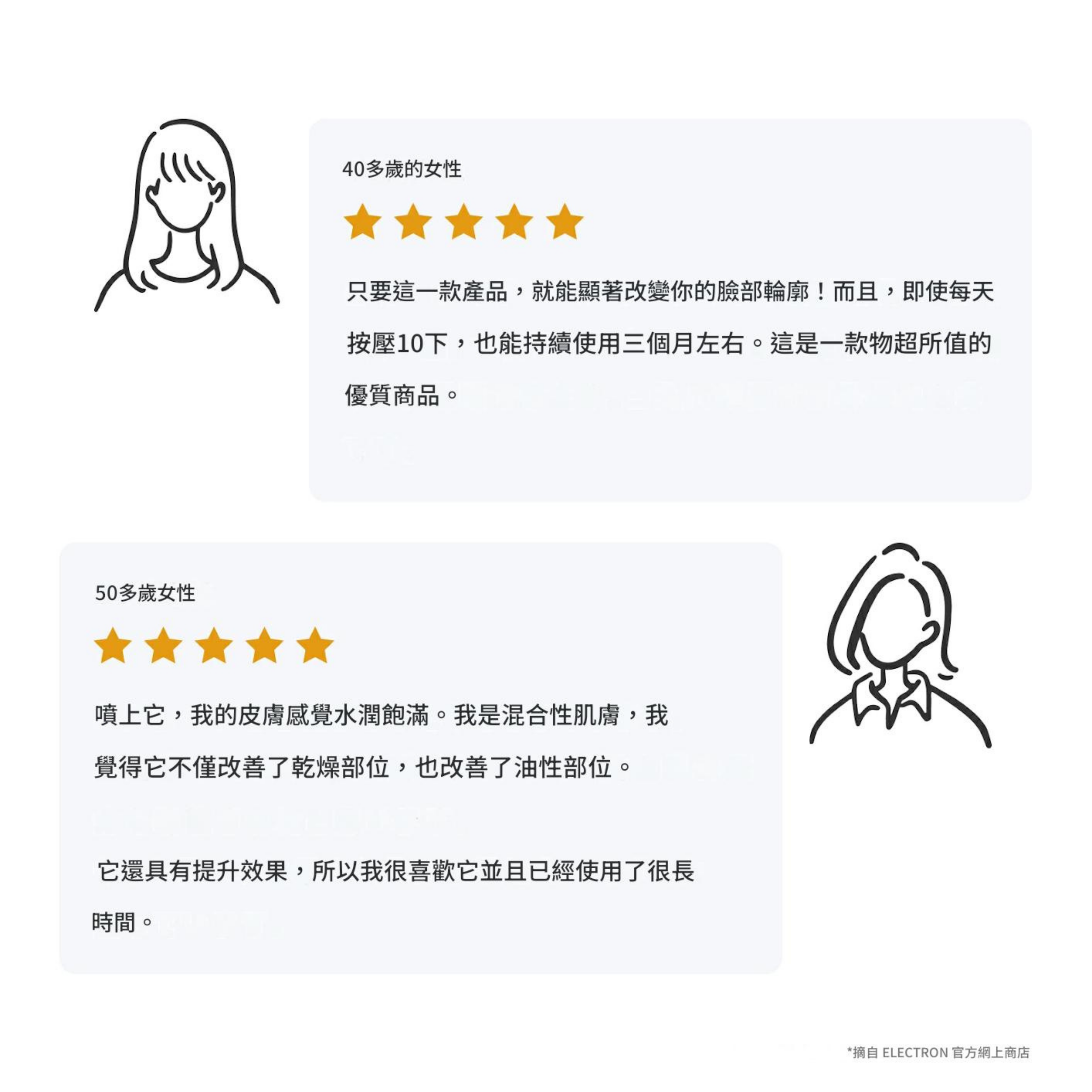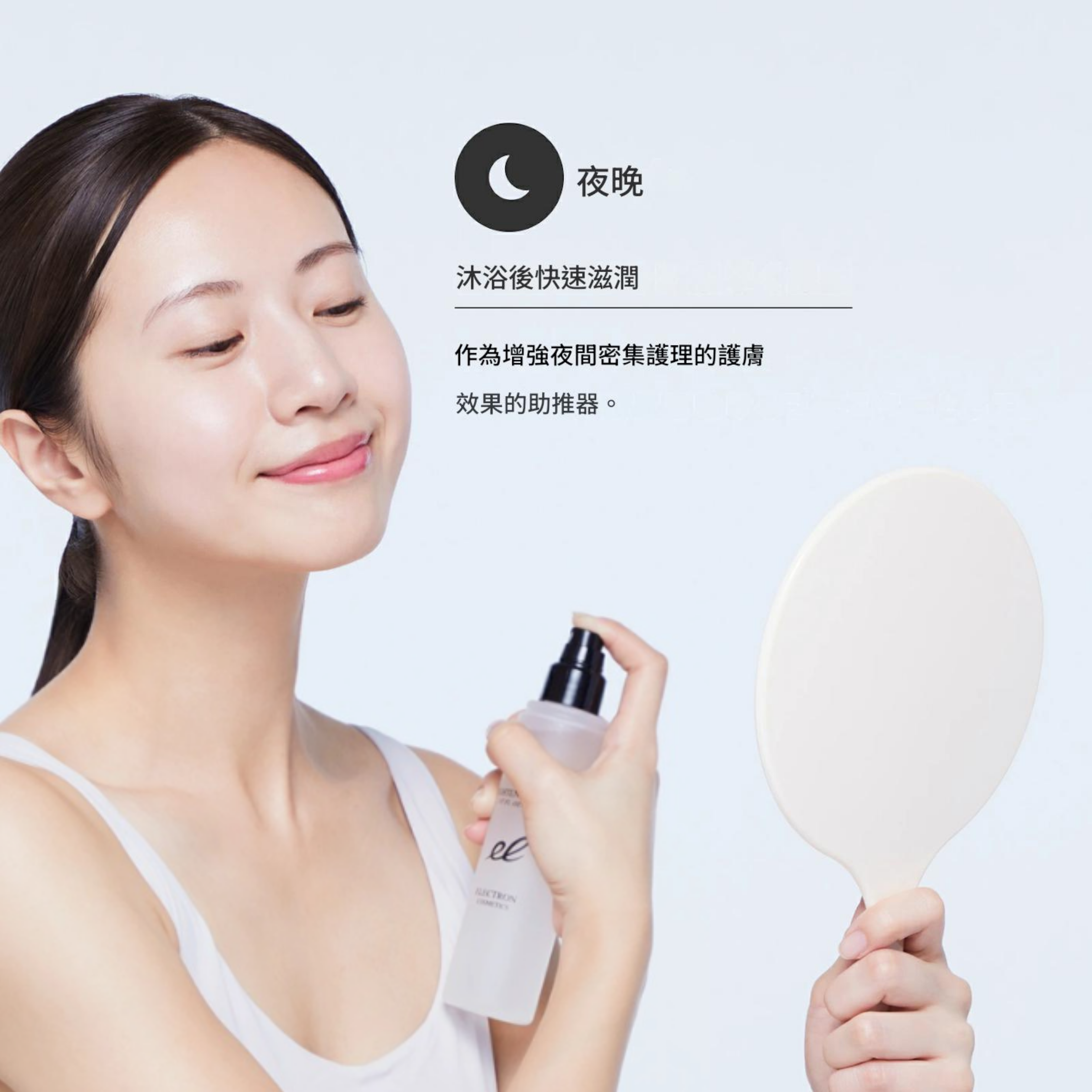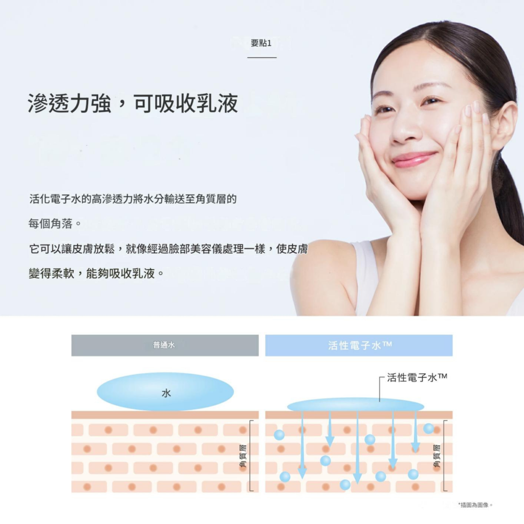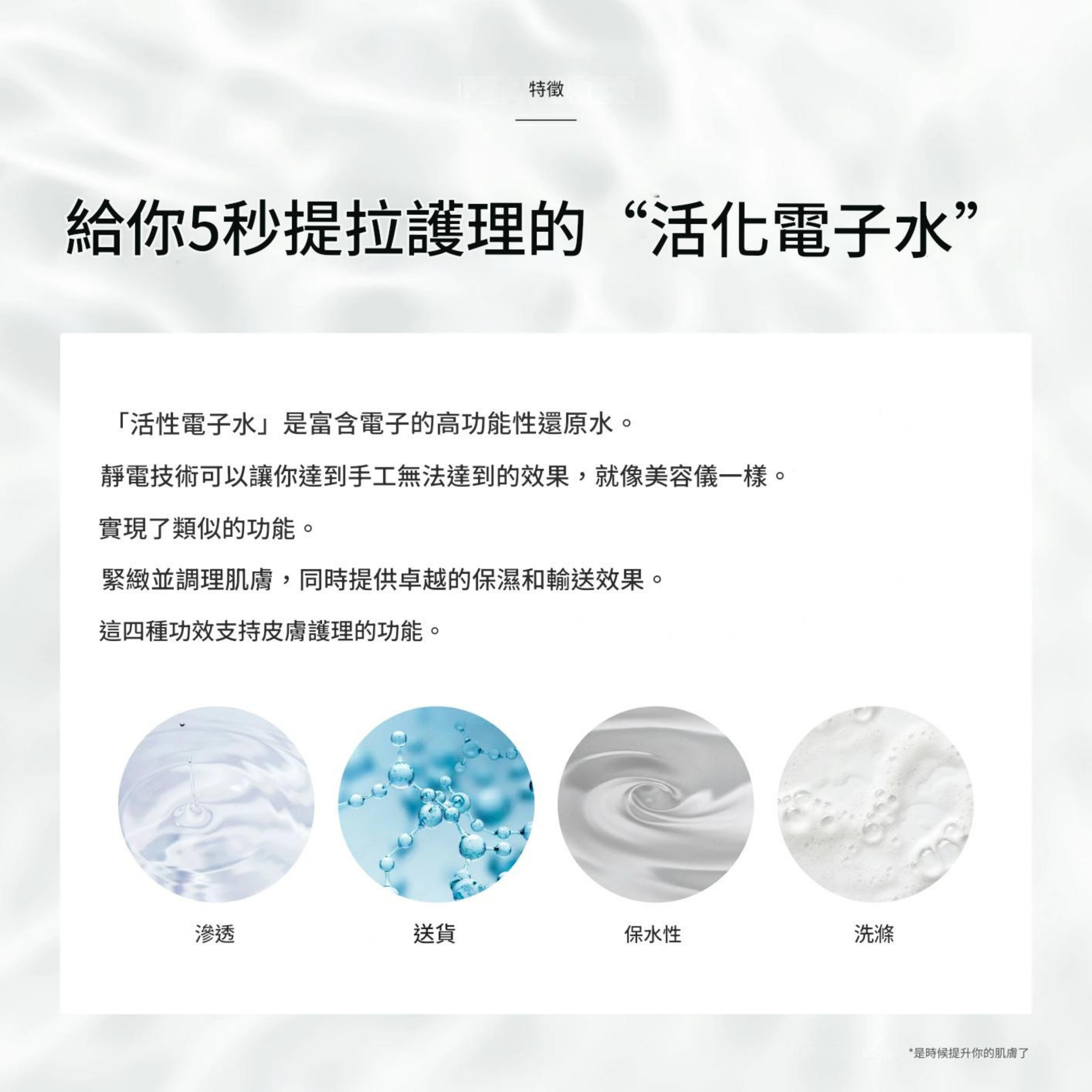 • Electron 獨家研發的高機能還原水,富含電子,具備極高滲透力與電荷反應。 能模擬美容儀器的提拉效果,促進肌膚代謝與吸收,實現「5秒即感緊緻」的護膚體驗。