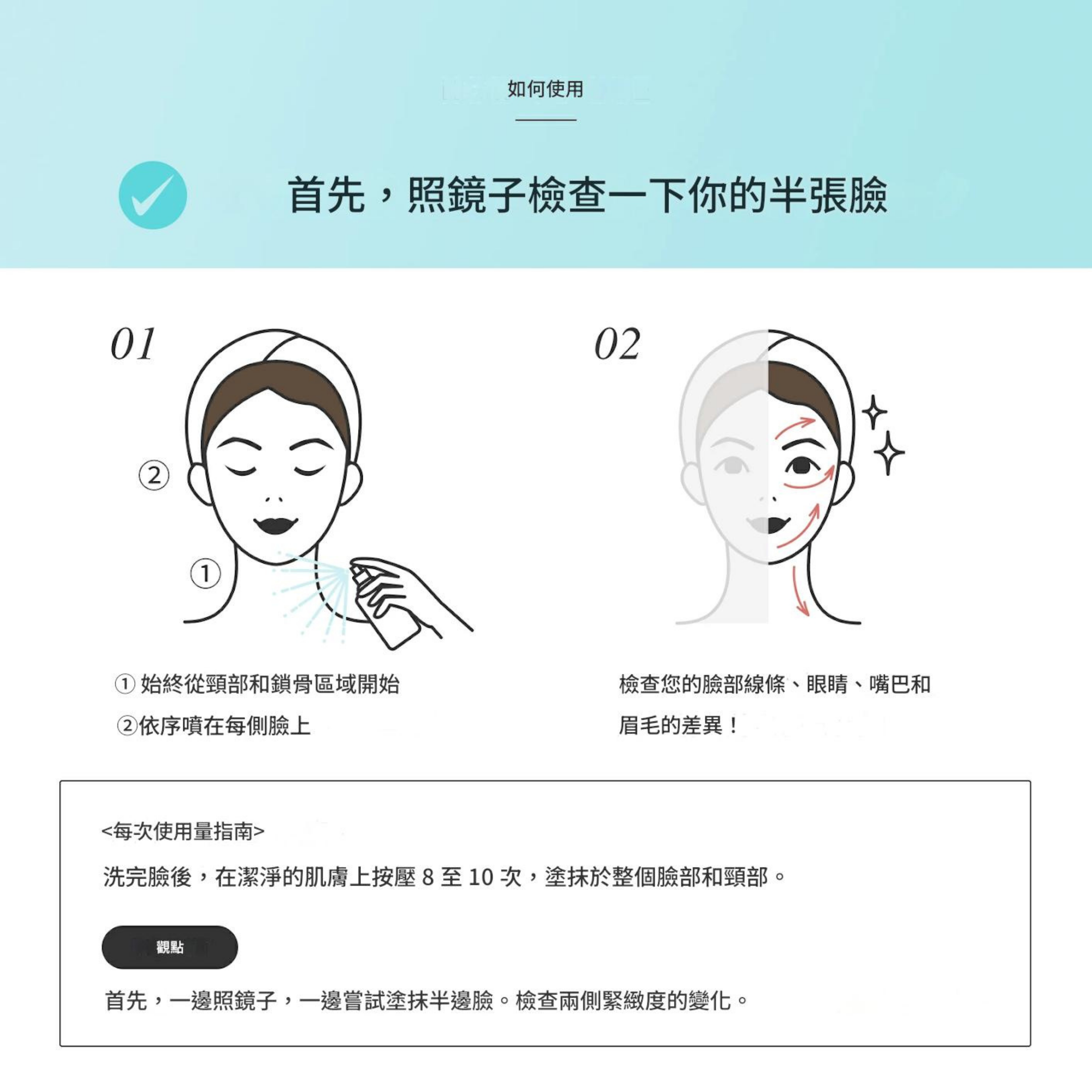 改增加肌膚彈力及提拉緊致 + 依克多因促進膠原蛋白生成,噴一噴即見提拉效果,