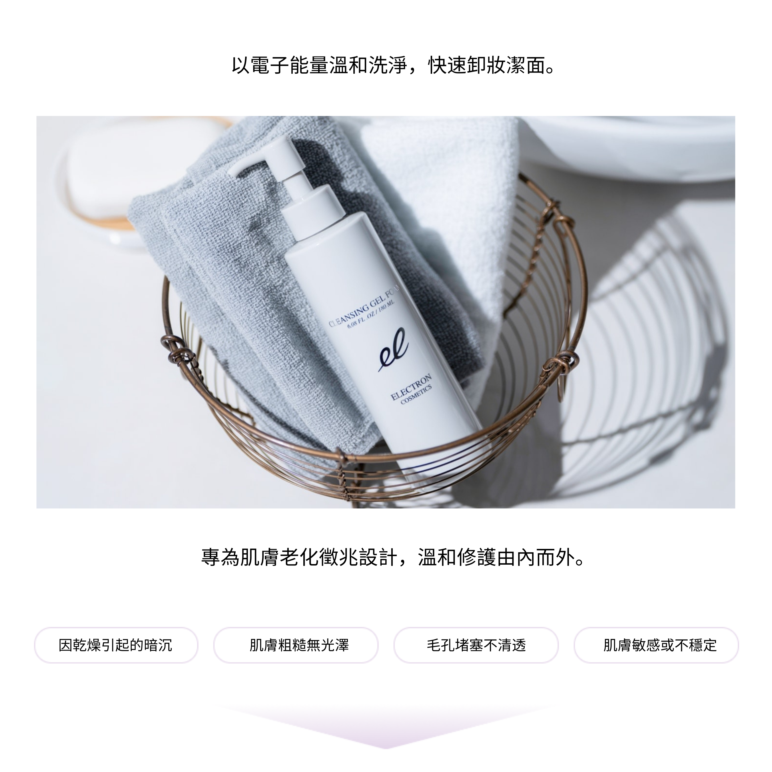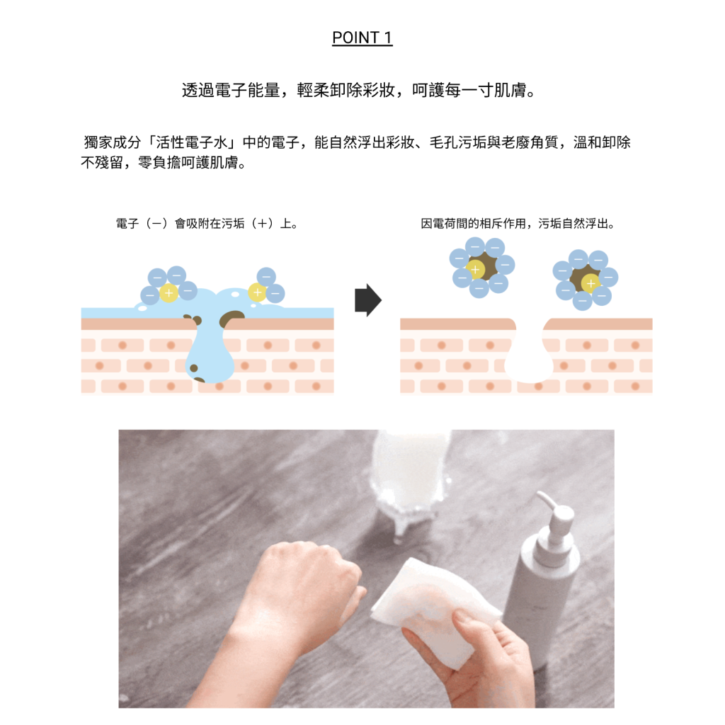 • Electron 獨家研發的高機能還原水,富含電子,具備極高滲透力與電荷反應。 能深入清潔毛孔,帶走污垢。
