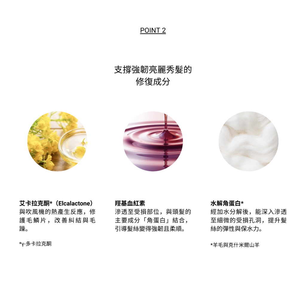 • El-calatone(γ-ドコサラクトン):與吹風機熱能反應,修補毛鱗片,改善打結與粗糙
