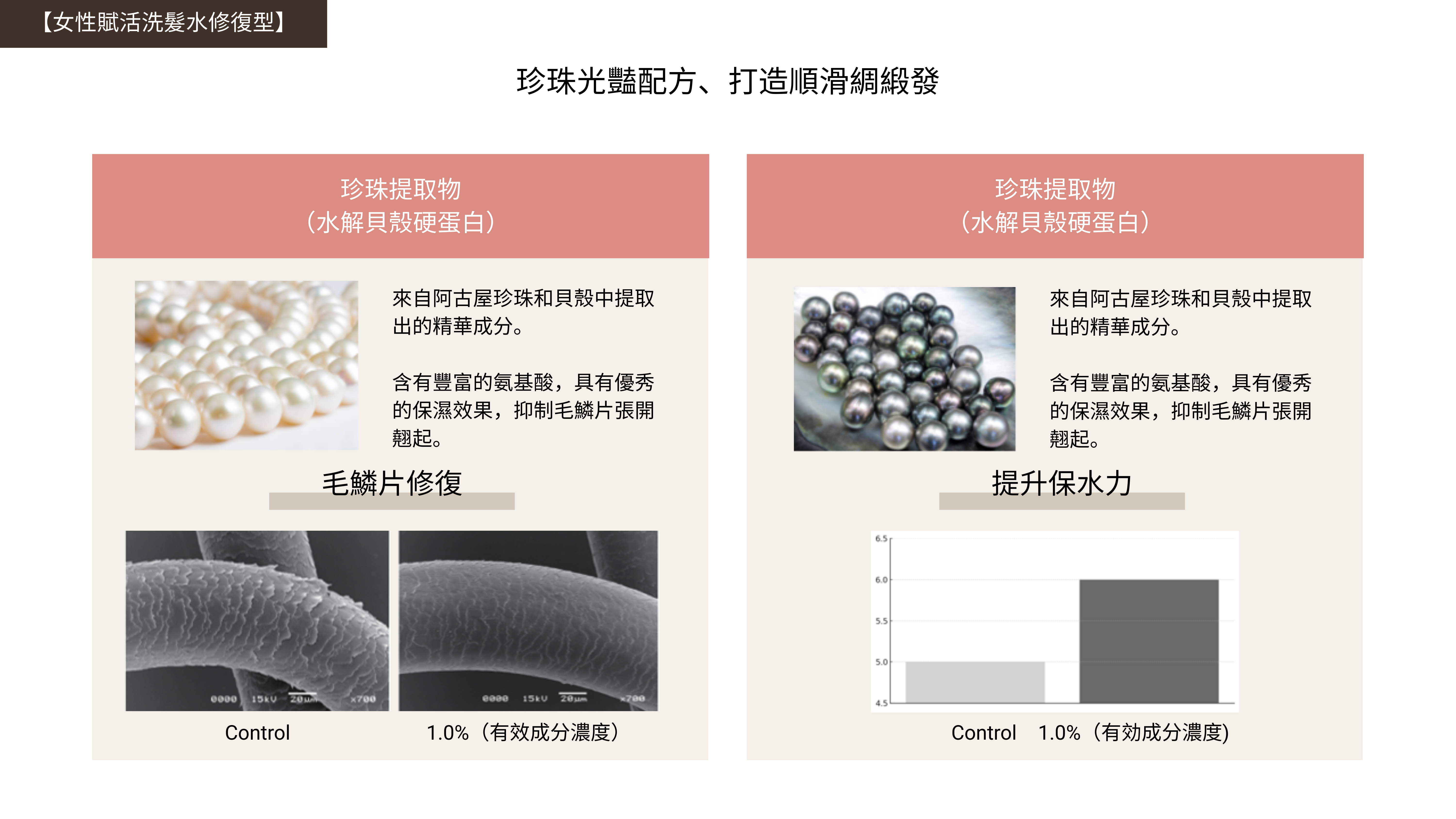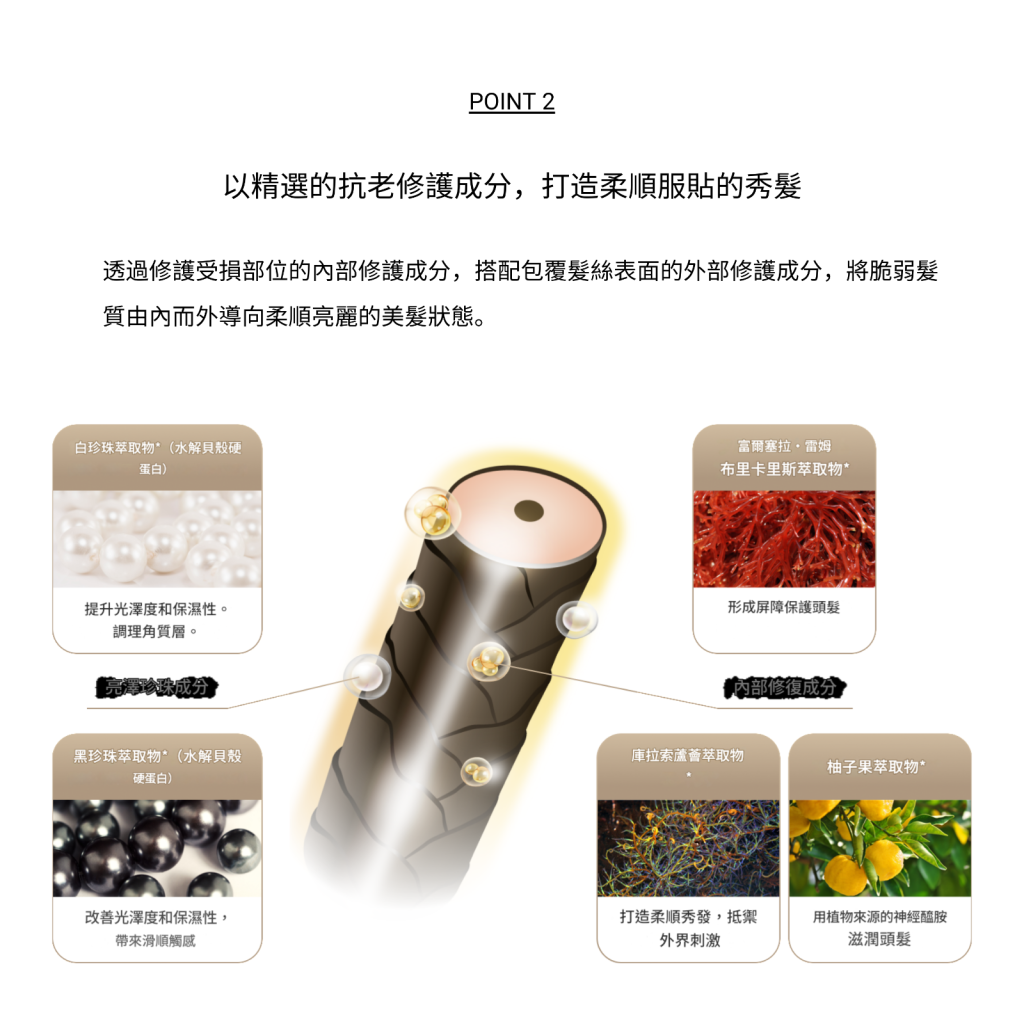 • 珍珠提取物 : 來自阿古屋珍珠和貝殼中提取出的精華成分,含有豐富氨基酸,修復髮絲毛鱗片