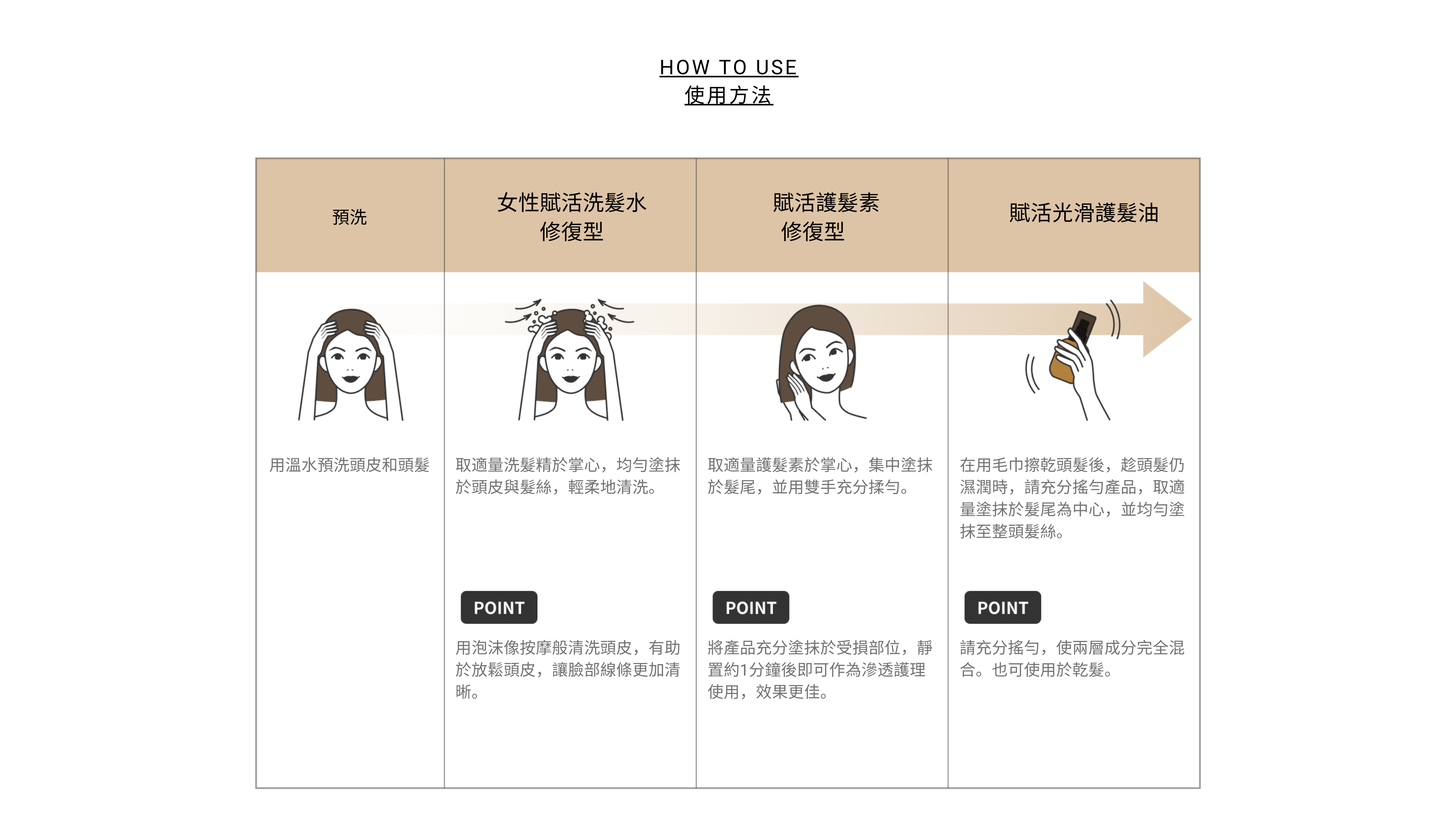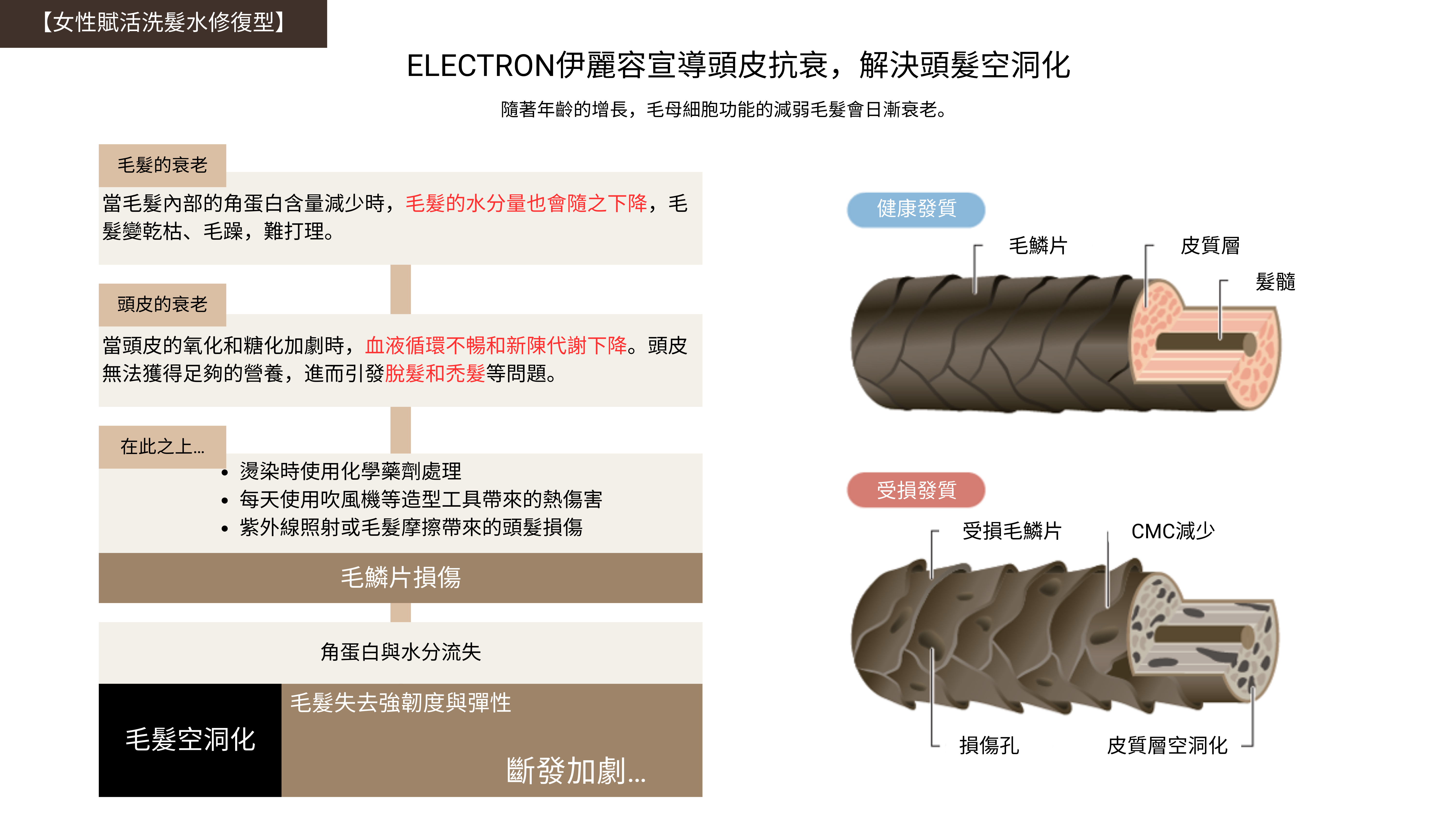 內修毛髮組織,外護毛鱗片損傷,添加抗熱傷害成分,保護毛鱗片並讓頭髮更加強韌。