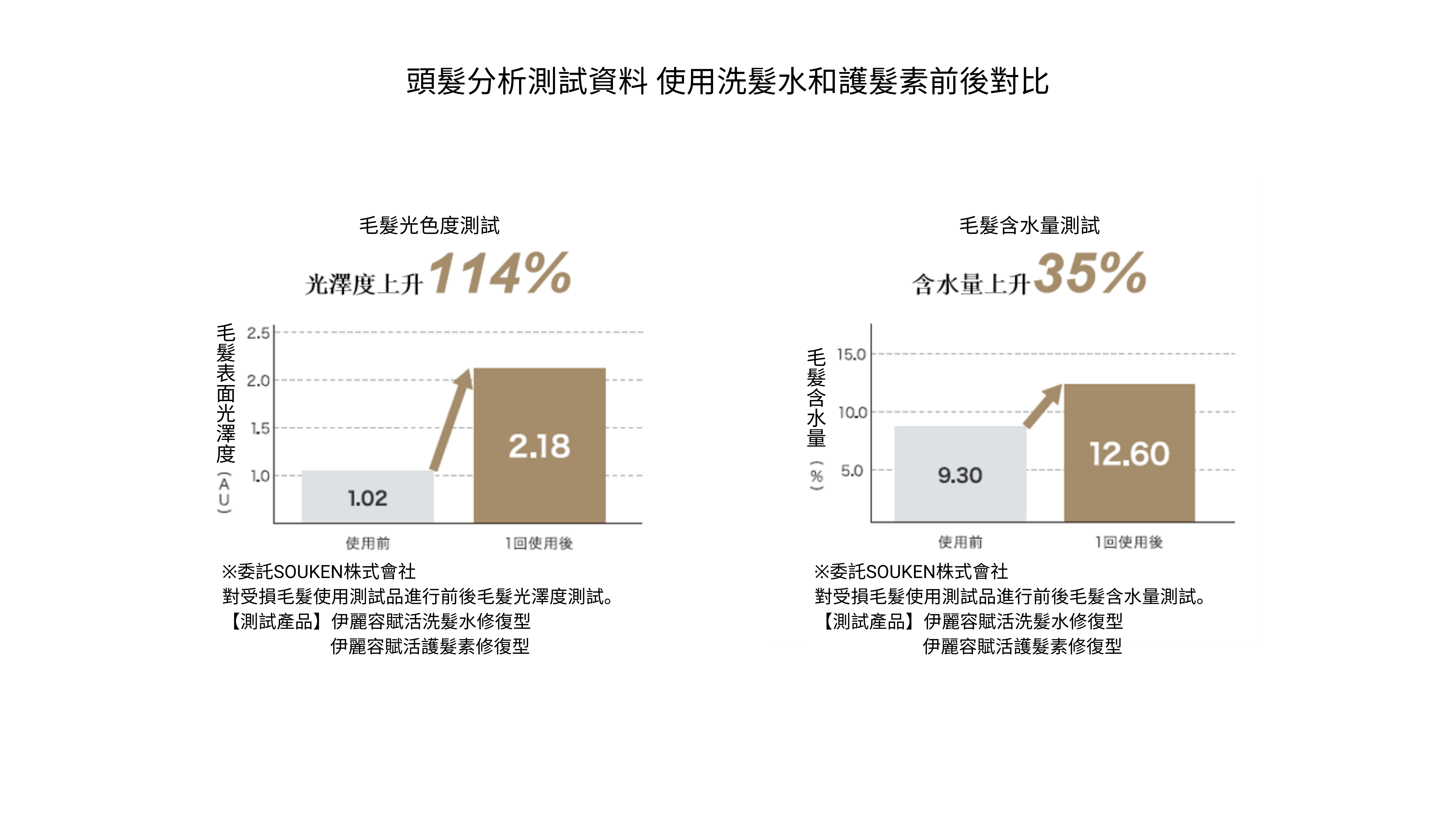 頭髮分析測試資料 使用洗髮水和護髮素前後,頭髮光澤度上升114%,含水量上升35%