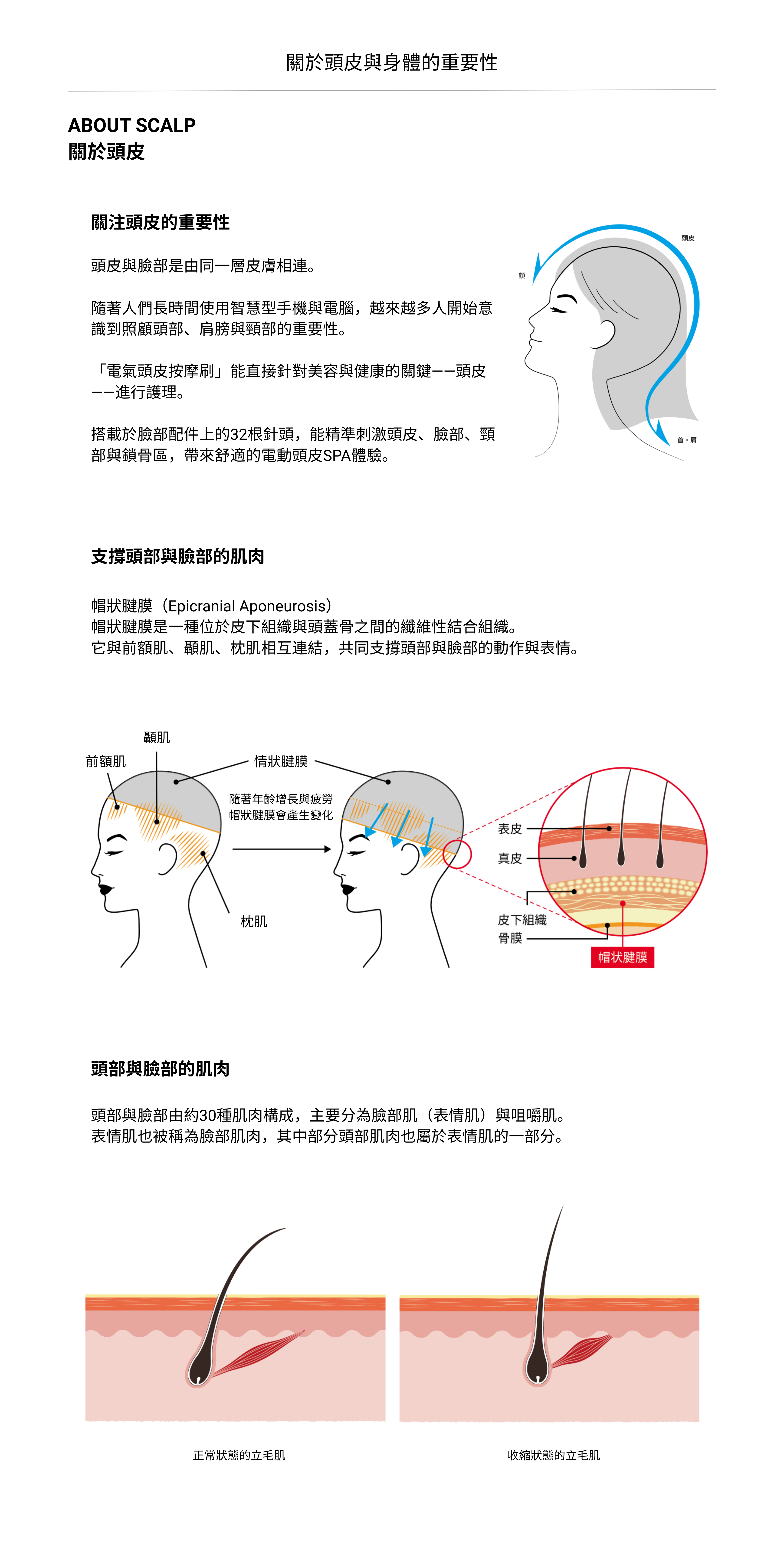 • 採用32~48根導電針梳刺激肌膚,深入皮下組織,促進循環與肌肉放鬆。FRF技術能針對壓力、老化與生活習慣造成的肌膚變化進行深層調理。