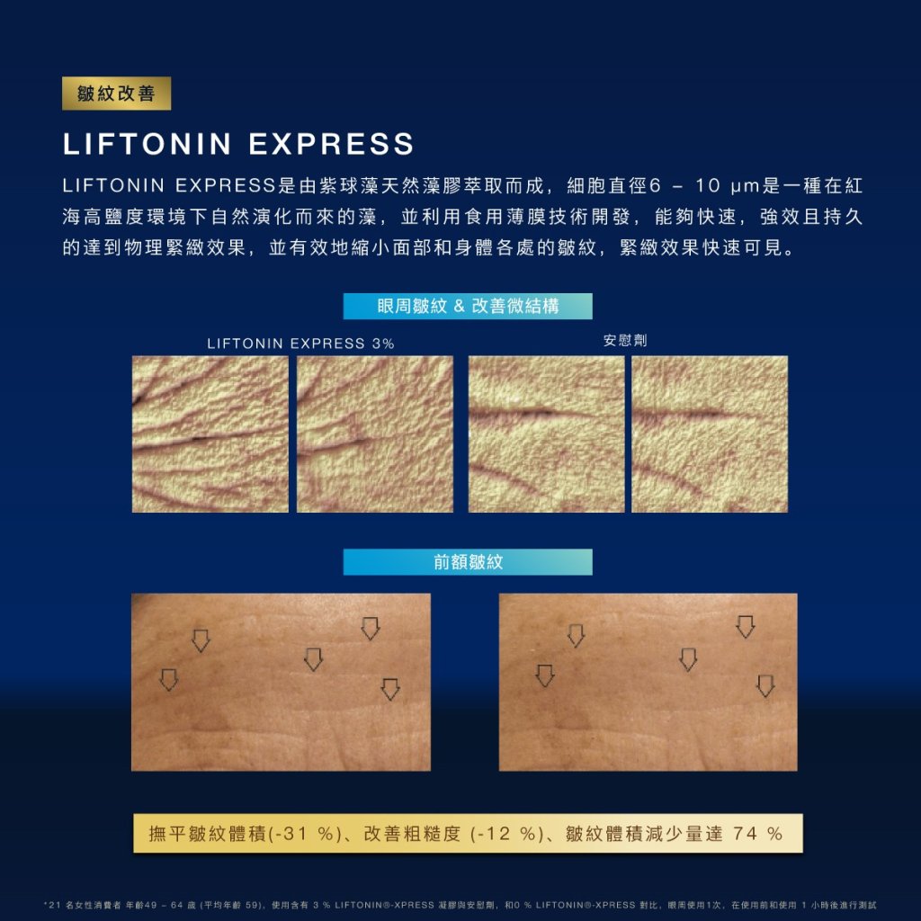 1. 彈性緊緻:瑞士研發的 LIFTONIN®-XPRESS,即時改善細紋與皺紋,持續緊緻提拉眼周肌膚,重塑年輕輪廓。