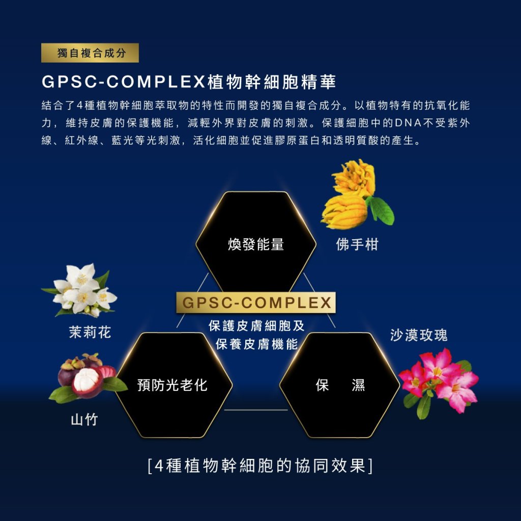 幹細胞修復:含山竹、佛手柑、茉莉花與沙漠玫瑰等植物幹細胞萃取,喚醒肌膚彈性與光澤,修復受損肌膚。