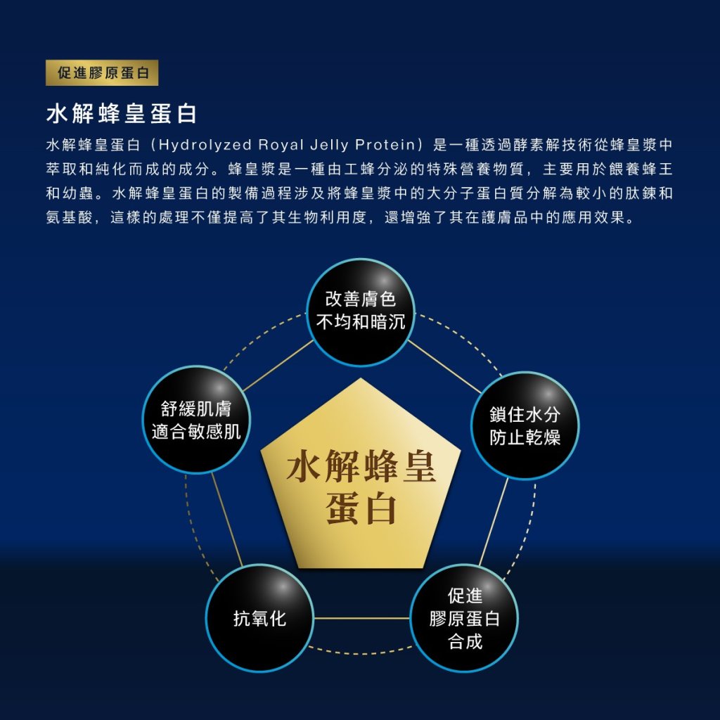 水解蜂王漿蛋白:榮獲金獎的創新成分,在紫外線環境下增強膠原蛋白生成,減少日曬引起的紅腫與不適,同時為肌膚提供
