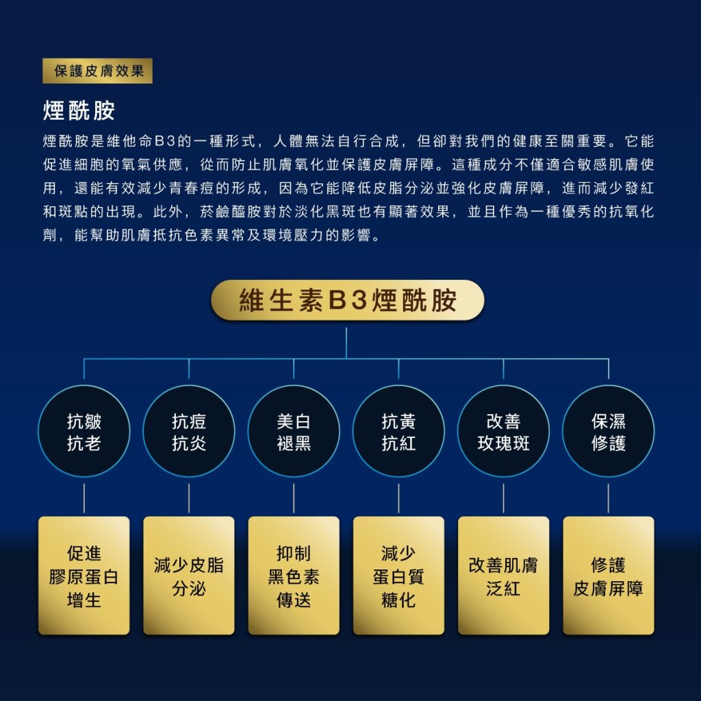 3. 抗老抗暗沉:添加煙酰胺(Niacinamide),抑制黑色素轉移,改善膚色不均與暗沉,強化肌膚屏障功能。